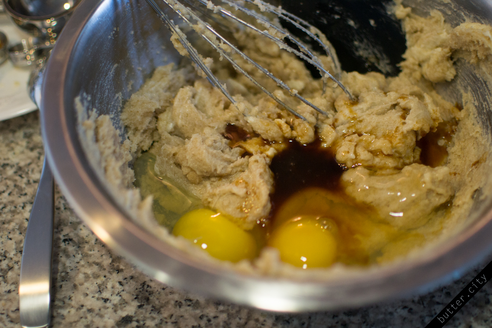 Cream 1/2 c butter (melted or softened) with 1/2 c brown sugar and 1/2 c white sugar. If butter was fully melted, let mixture sit at room temperature for 10 minutes to slightly solidify. Then mix in 1 egg, 1 tsp vanilla, and 1/2 tsp salt.