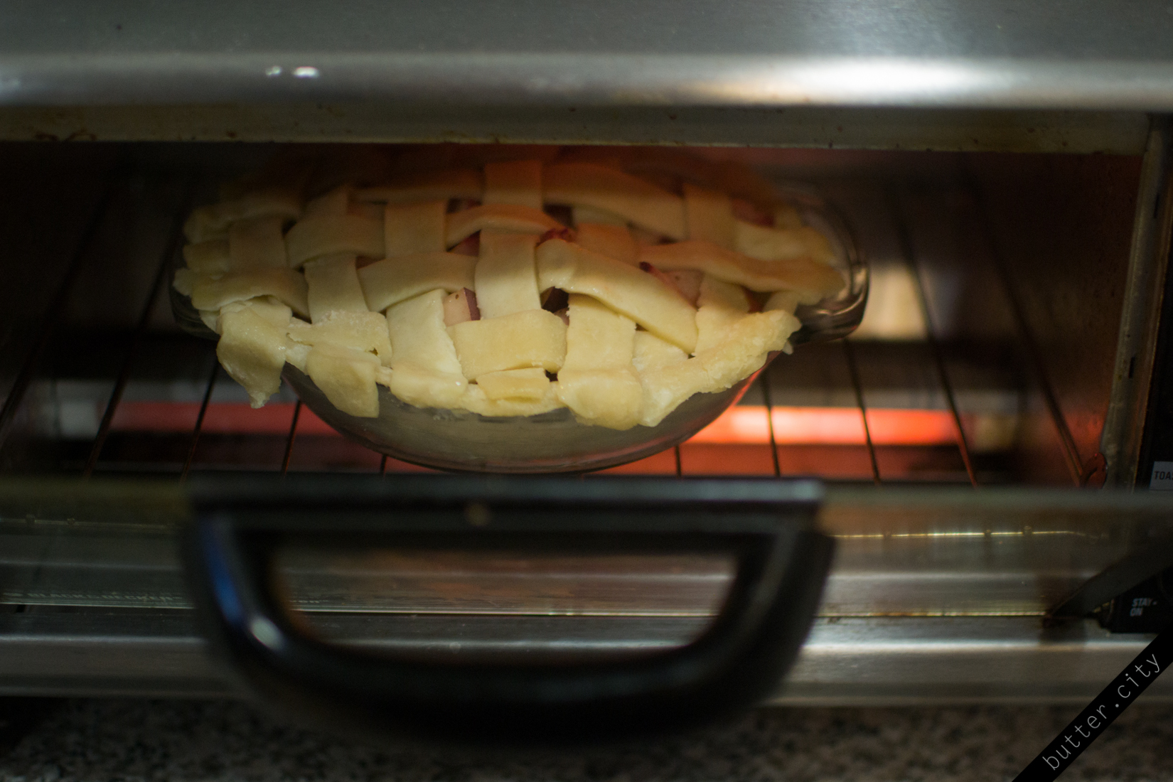 After 15 minutes, pour out excess juice (if any) then scoop fruit into pie crust. Cover with lattice top and press down pie edges to seal. Bake in a toaster oven at __deg F for __ minutes, reducing the temperature by 50 degrees after __ minutes if tops get too brown. Let chill in refrigerator for at least an hour to set, or enjoy it’s toasty goodness as-is.