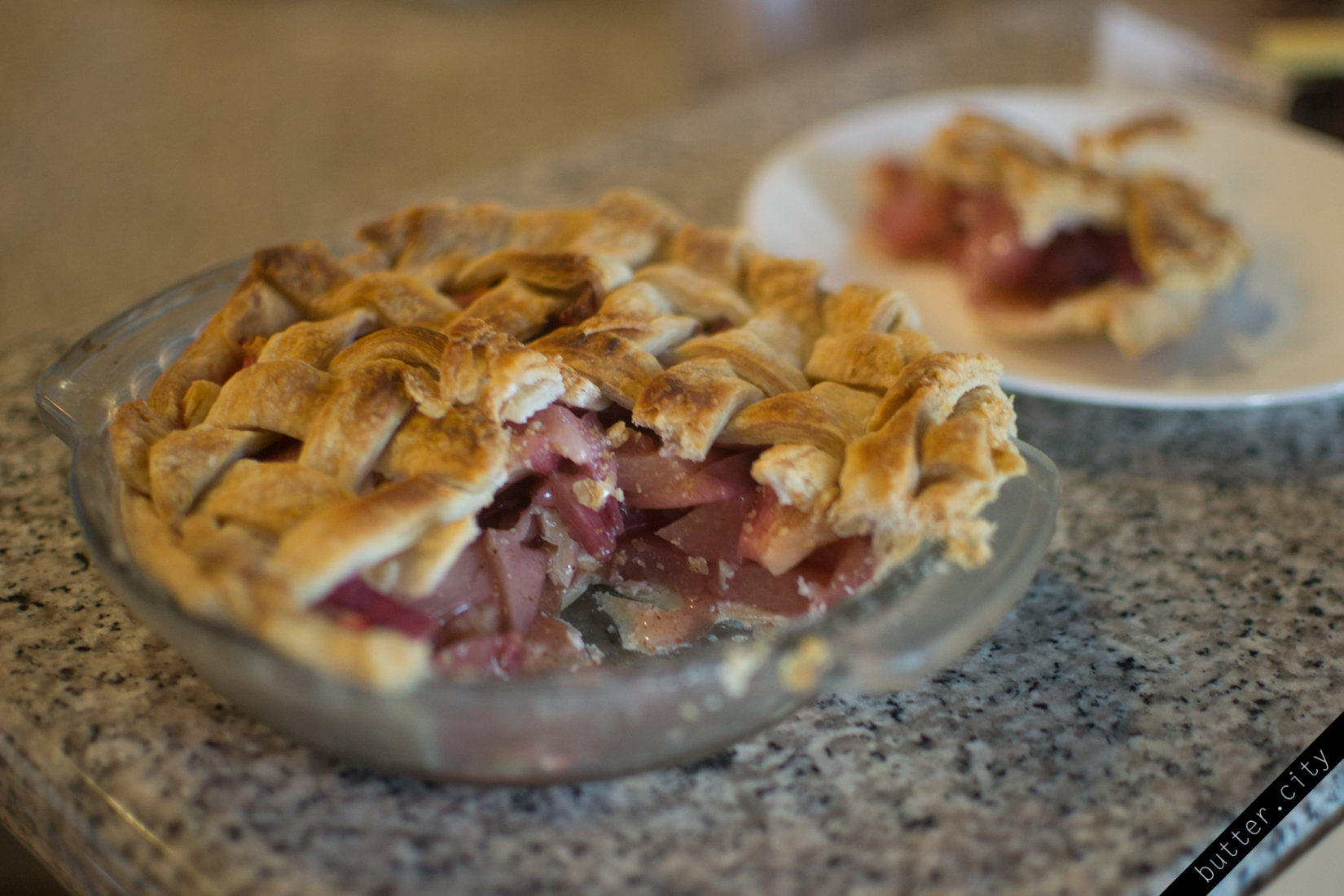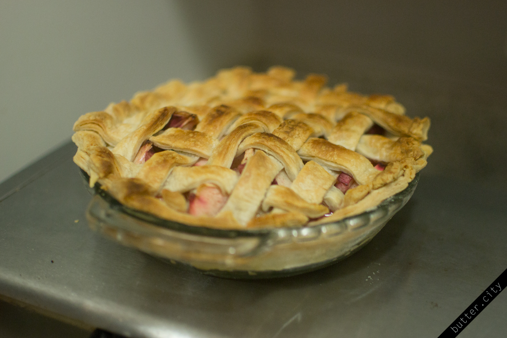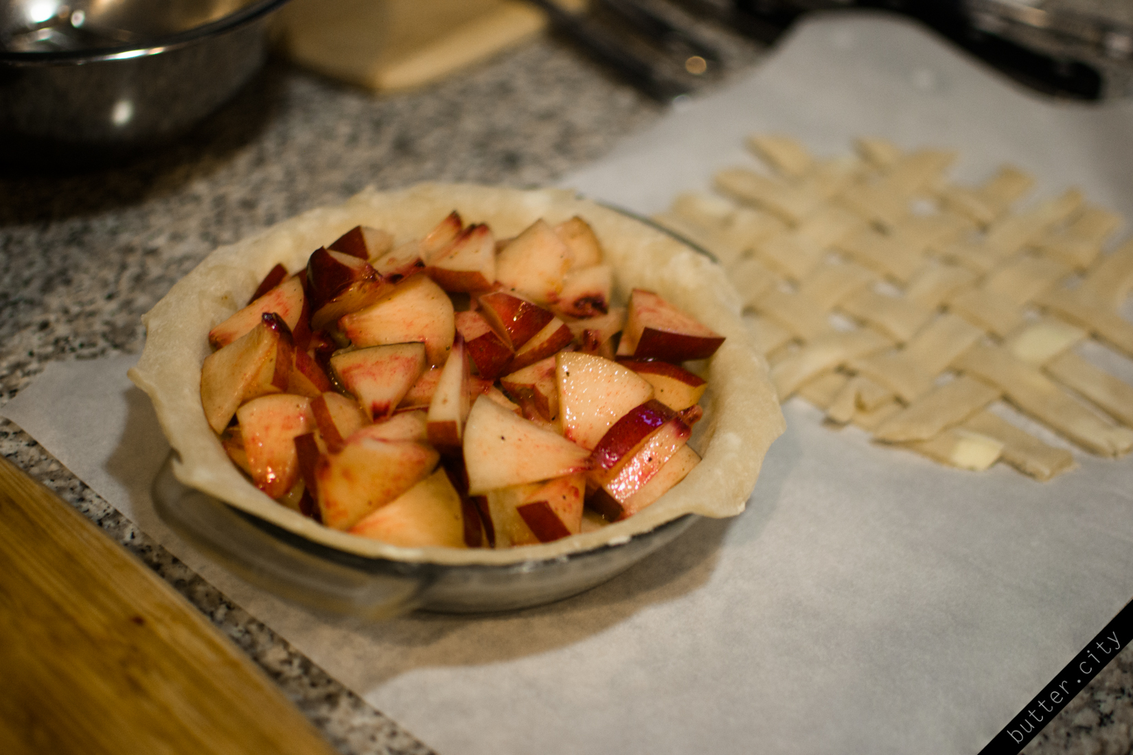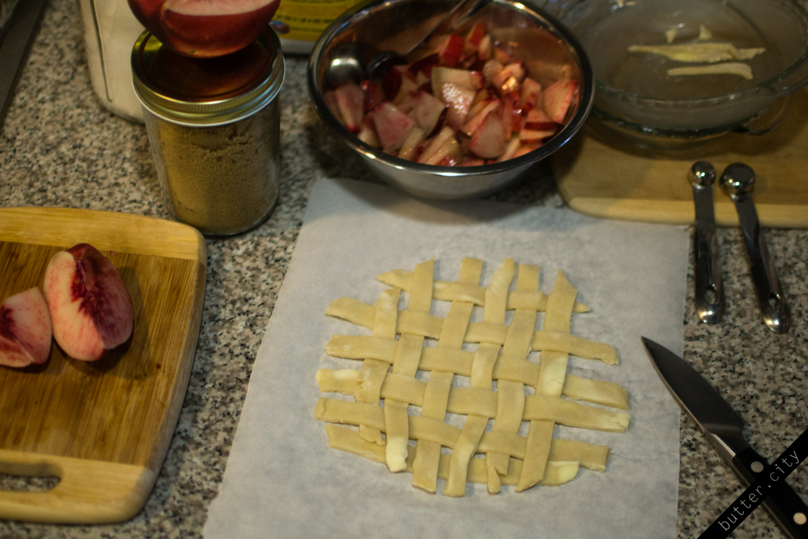 With the rest of the dough, make a similarly sized circle – slightly smaller is ok. Cut into strips horizontally, then rotate every other strip 90 degrees and create a lattice. (Should I have a separate post on making a lattice? I forgot to take pictures…) Place in refrigerator until ready.