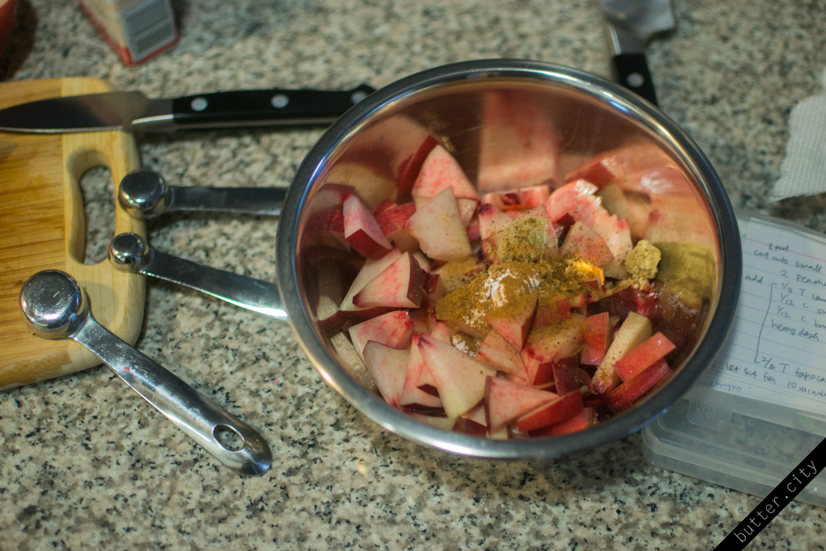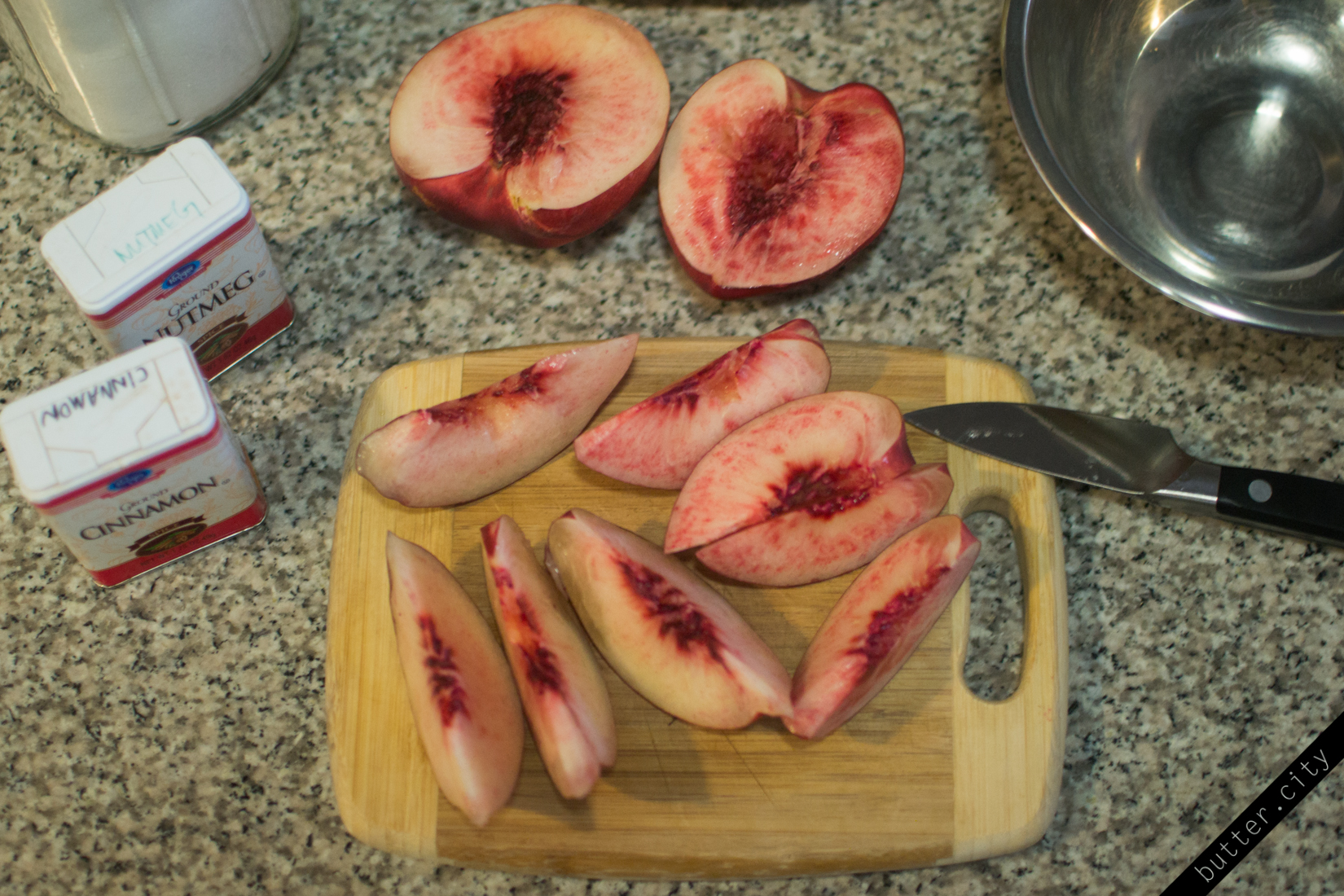 I’m using nectarines here, but the recipe works just as well with hard peaches or apples – pears might be too juicy, but I’ll take that upon myself to test this fall. Will report back.