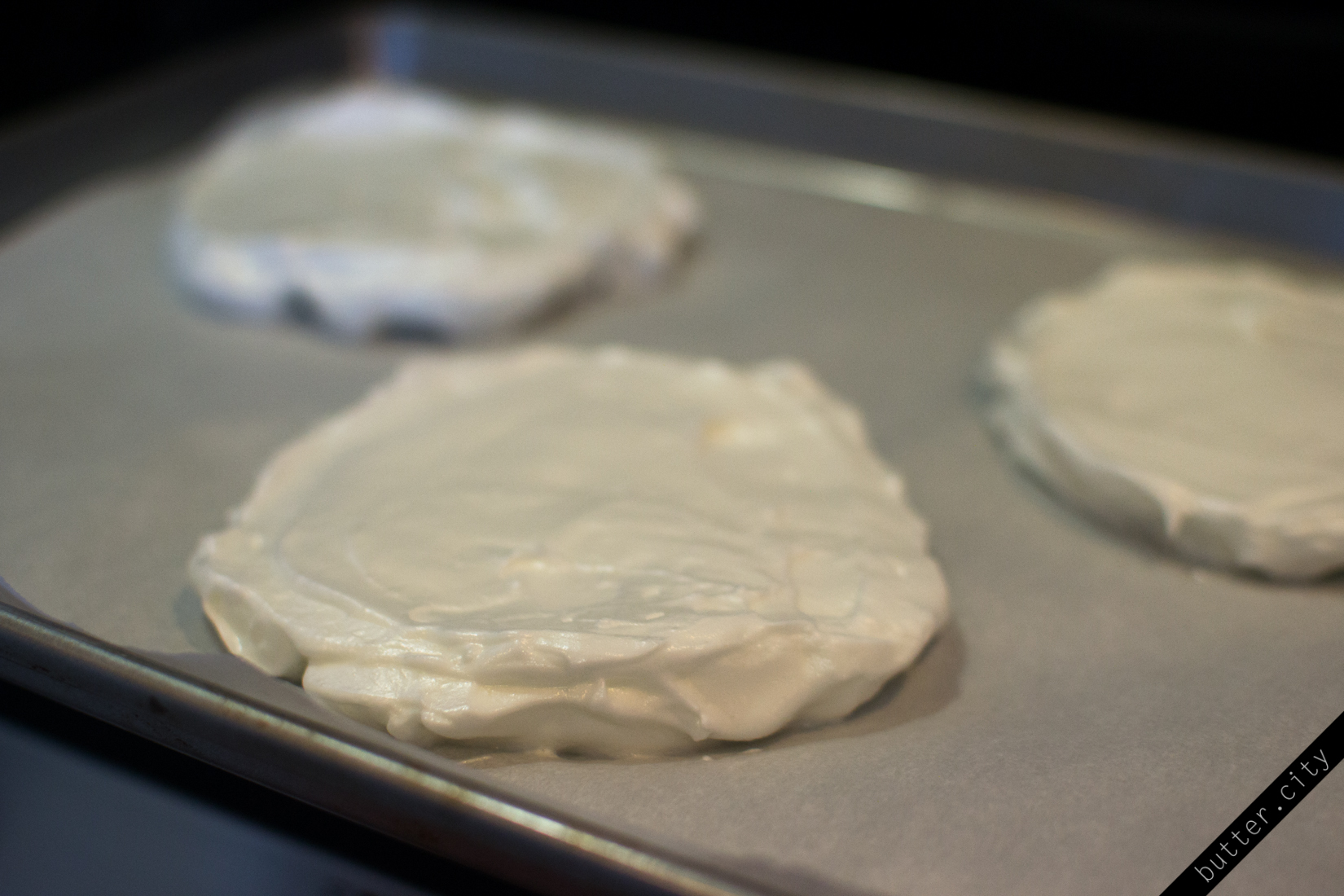 Preheat oven to 220 deg F. Using a spoon or spatula, drop meringue into three similarly sized blobs on your baking sheet, at least 7″ apart. Use your flat spatula to slowly press and spread the meringue into flat disks approximately 6″ in diameter and 1/2″ thick, using small back and forth motions like frosting a cake. Bake for 2.5-3 hours, until meringues are evenly light brown (like a milky latte). Keep in oven for an additional hour or overnight to dry out completely.
