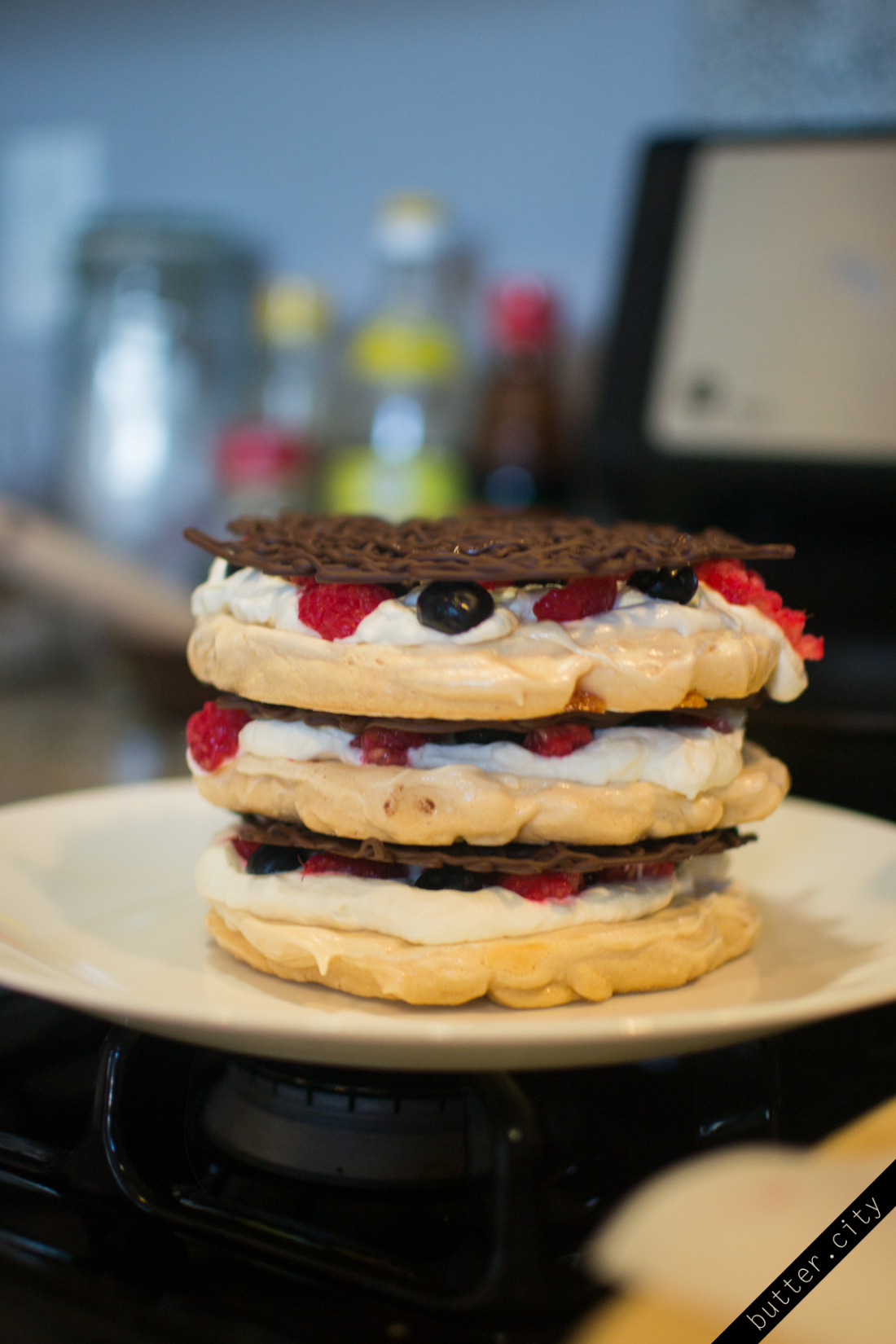Ready for assembly! On your serving plate, plate a small amount of whipped cream on the plate to stabilize the first meringue layer. Press down with the meringue to secure. Dollop about 1/3 of your remaining whipped cream onto the center of the first meringue layer, spread with a spatula just to the edge of the meringue. Top with 1/4 c berries, then a chocolate “wafer”. On top of the chocolate, place a little bit of whipped cream to secure the next layer of meringue. Repeat whipped cream, berries, chocolate two more times with the last layer.