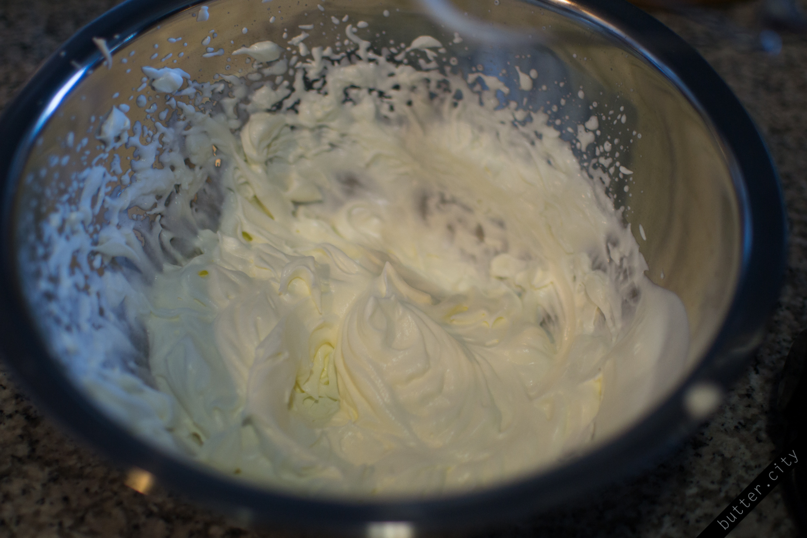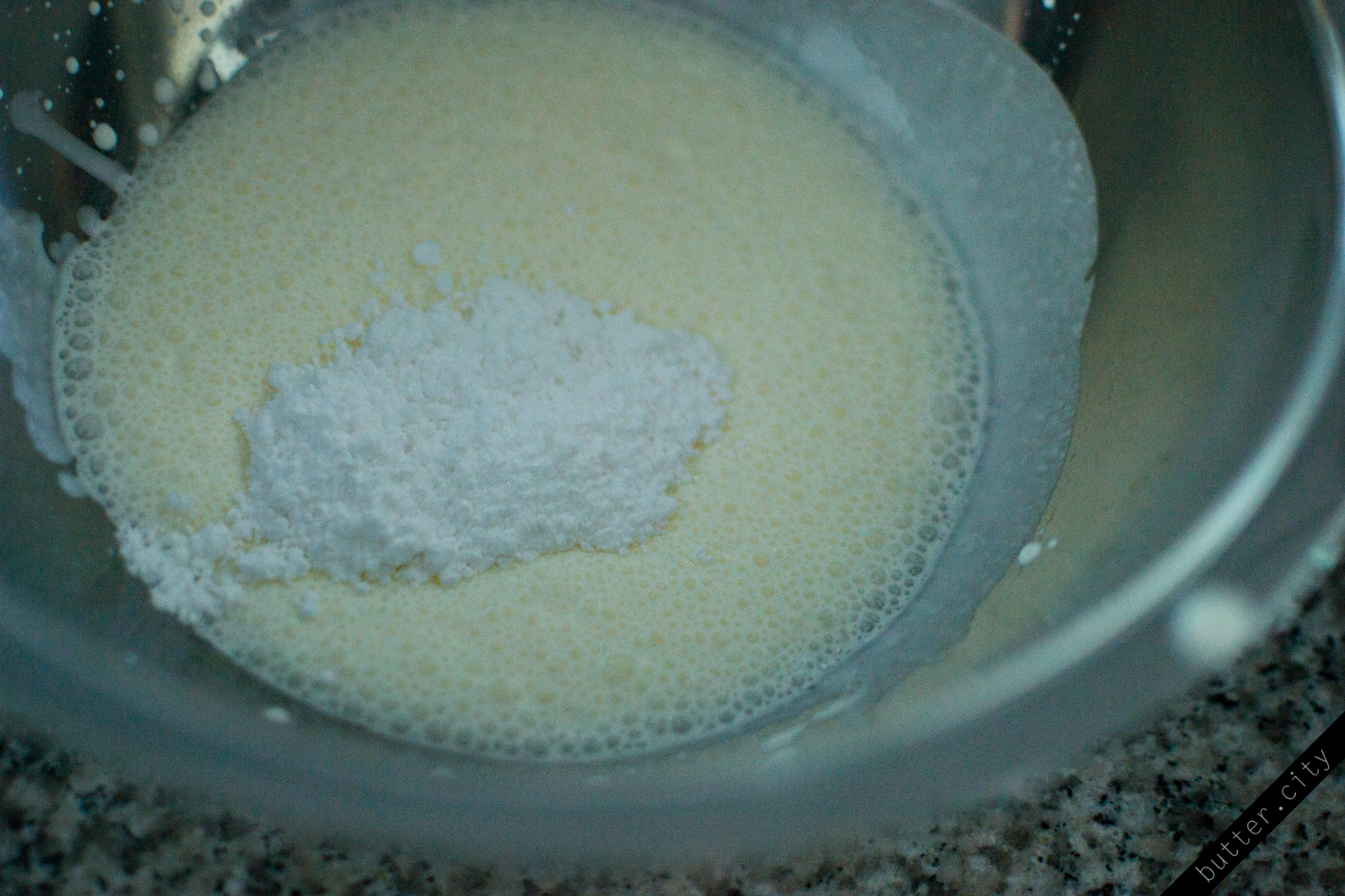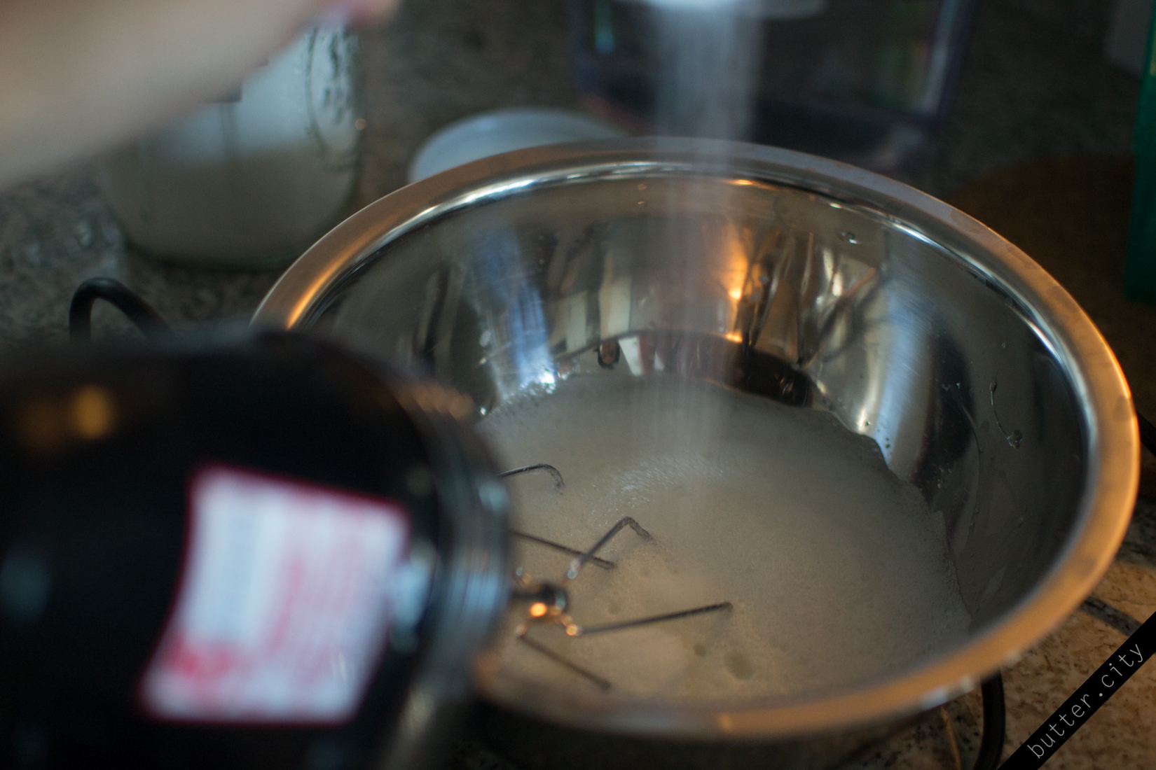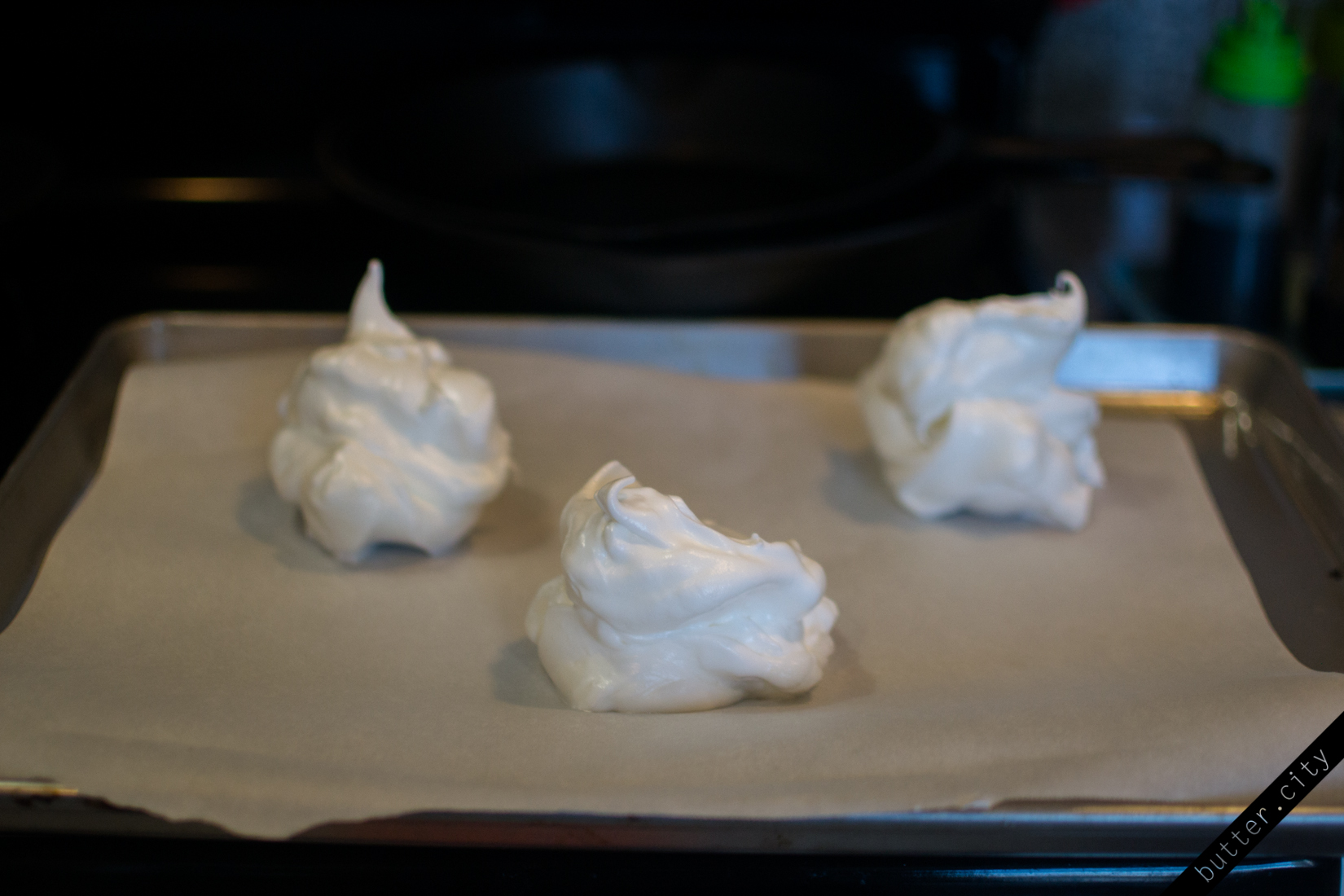 Begin whisking 2 egg whites with an egg beater. Add in 1/3 c sugar in a slow, steady stream, pausing occasionally to allow the sugar to fully combine with the meringue. (This is so your meringue won’t weep!) When all the sugar has been added, continue whisking until meringue forms stiff peaks.