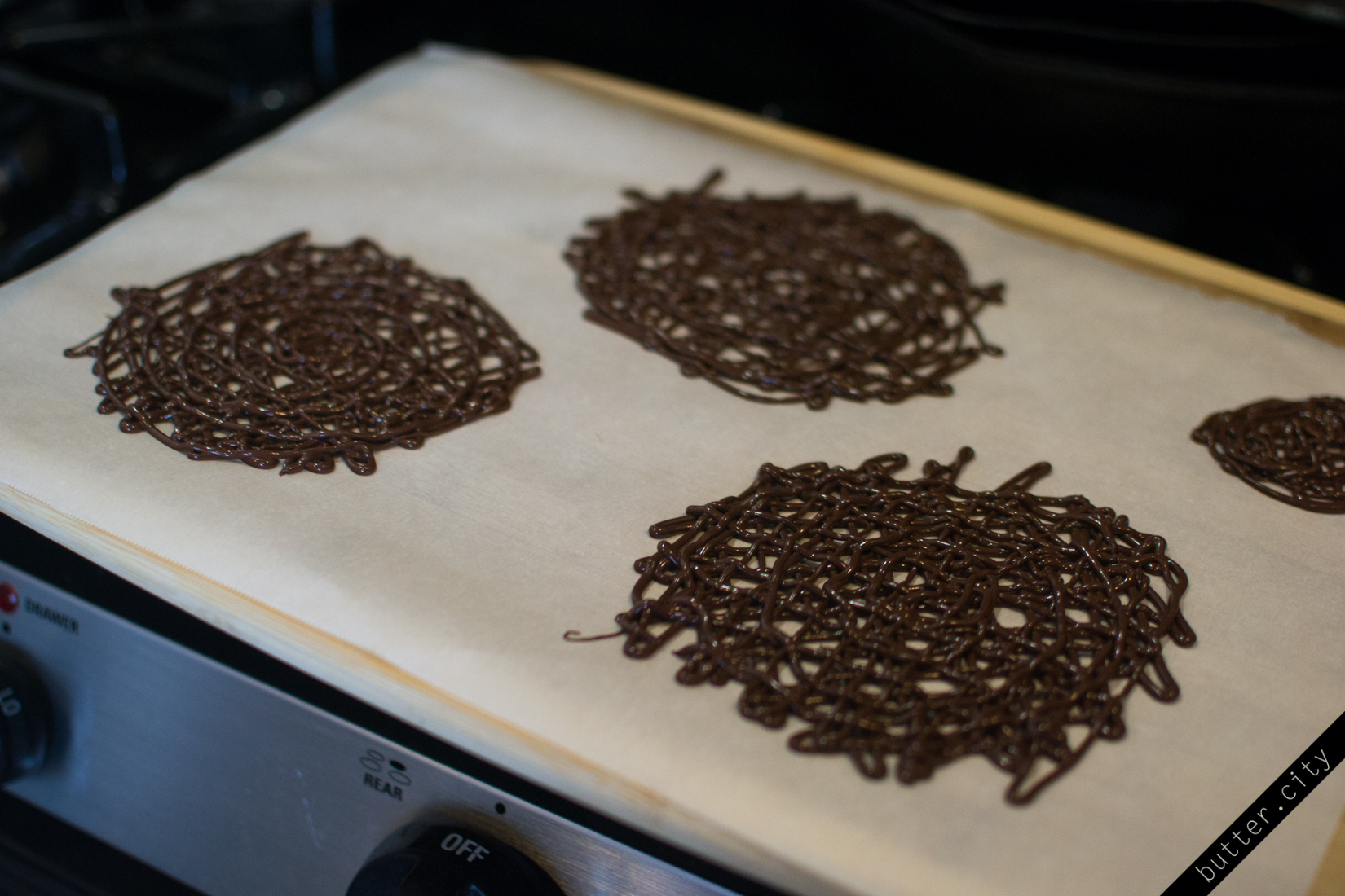In the mean time, melt 1/4 c chocolate chips in the microwave (mix often, don’t overheat) and fill a pastry bag or Ziploc bag with the warm, melted chocolate. Cut a small opening and doodle loops and lines continuously to make a criss-cross pattern of chocolate about 6″ in diameter. Make three of these, then refrigerate.
