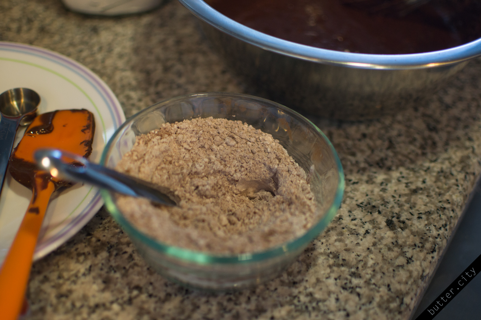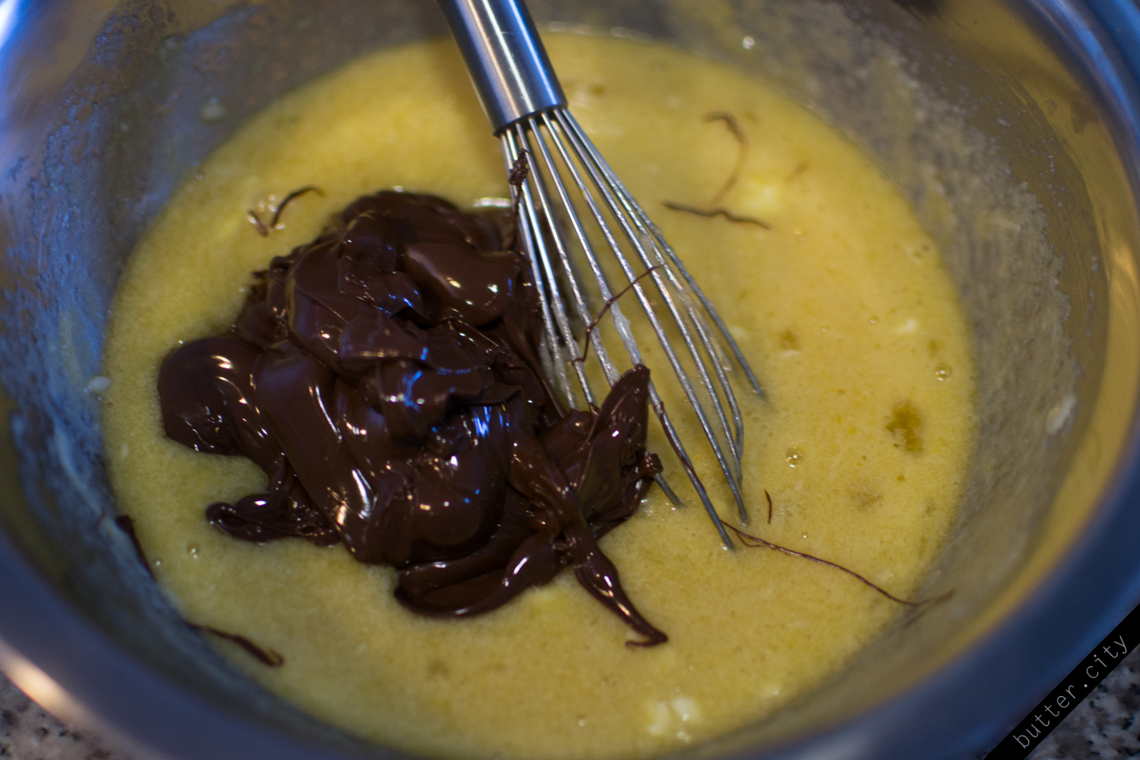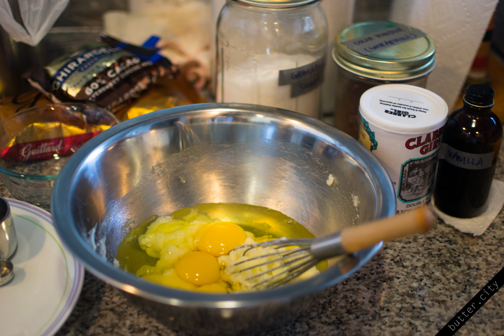Cream together 5 Tbsp butter and scant 1 c granulated sugar in a large bowl. Mix in 3 eggs, one at a time, then 1 1/2 tsp vanilla. Separately, mix together dry ingredients in a small bowl: 5/8 c flour, 1 1/2 Tbsp cocoa powder, 1/4 tsp baking powder and 1/4 tsp salt.