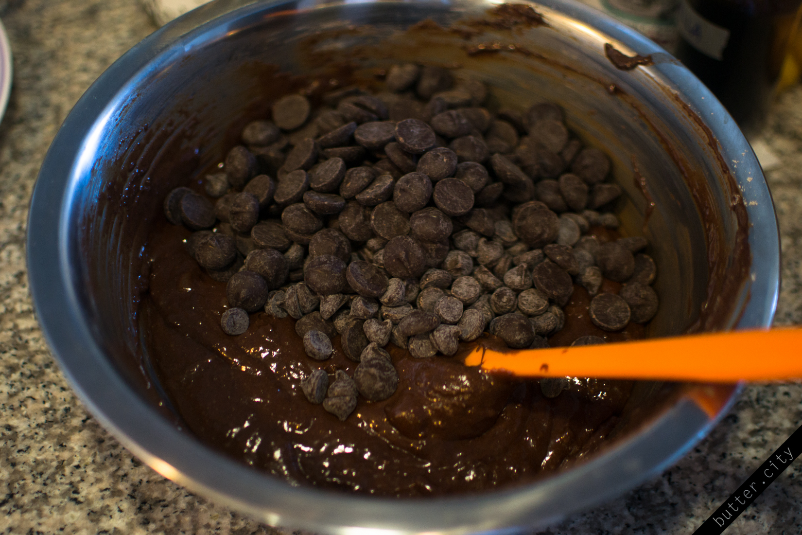 Add melted chocolate to butter-sugar-egg mixture and mix completely. Then add in dry ingredients and mix until well combined. Stir in 2 c chocolate chips. The batter will be very thick and difficult to mix; this is the way it should be. If smooth and easy to mix, allow to cool for 10-15 minutes before dropping out in 3 Tbsp scoops (about 1.5″ diameter balls) onto cookie sheets.
