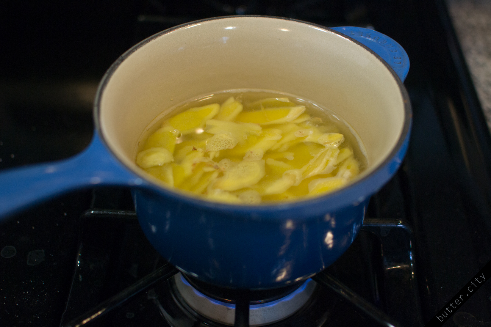 Peel 1/2 lb ginger (using this trick!!) and cut into slices as thin and uniform thickness as possible. Place into a small saucepan and add 2 c water and 2 c sugar. Bring to a boil and continue heating until temperature reaches 225 degrees F, or close. It should take about 30 minutes. Make sure to keep your thermometer away from the sides of your pan to maintain an accurate reading.