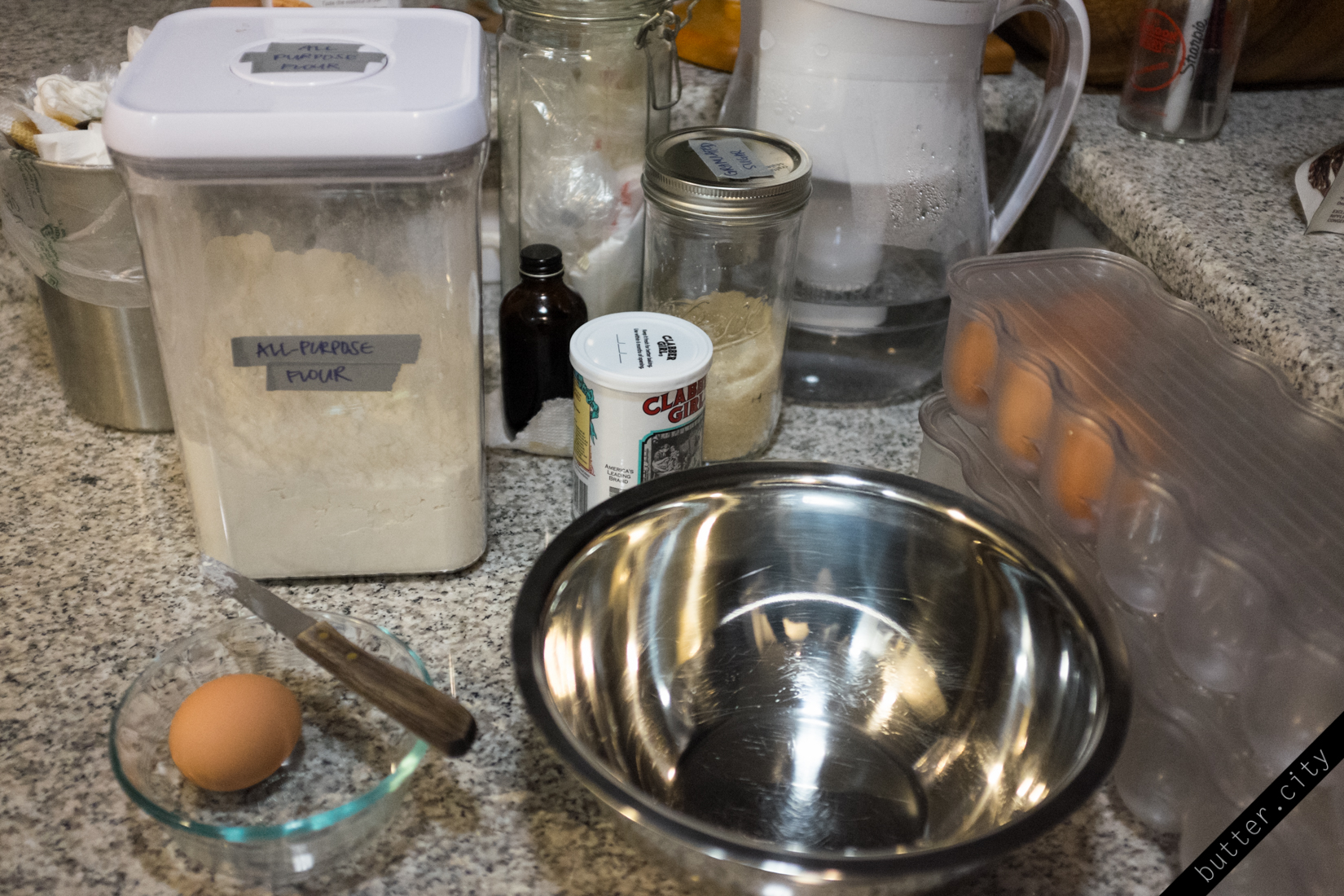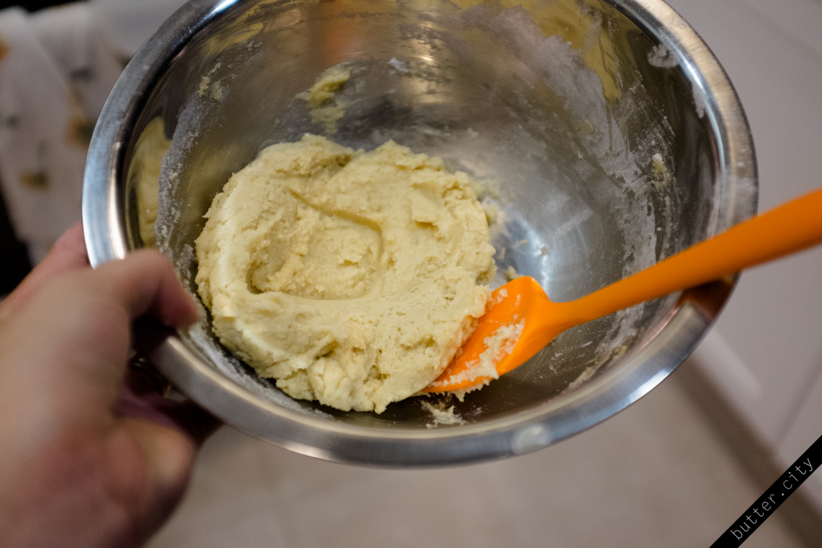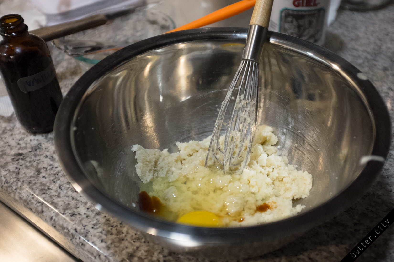 Cream together 6 Tbsp unsalted butter and 1/2 c granulated sugar. Mix in 1 large egg and 1/4 tsp vanilla extract. Mix in1 1/4 c all-purpose flour and 1/2 tsp baking powder.