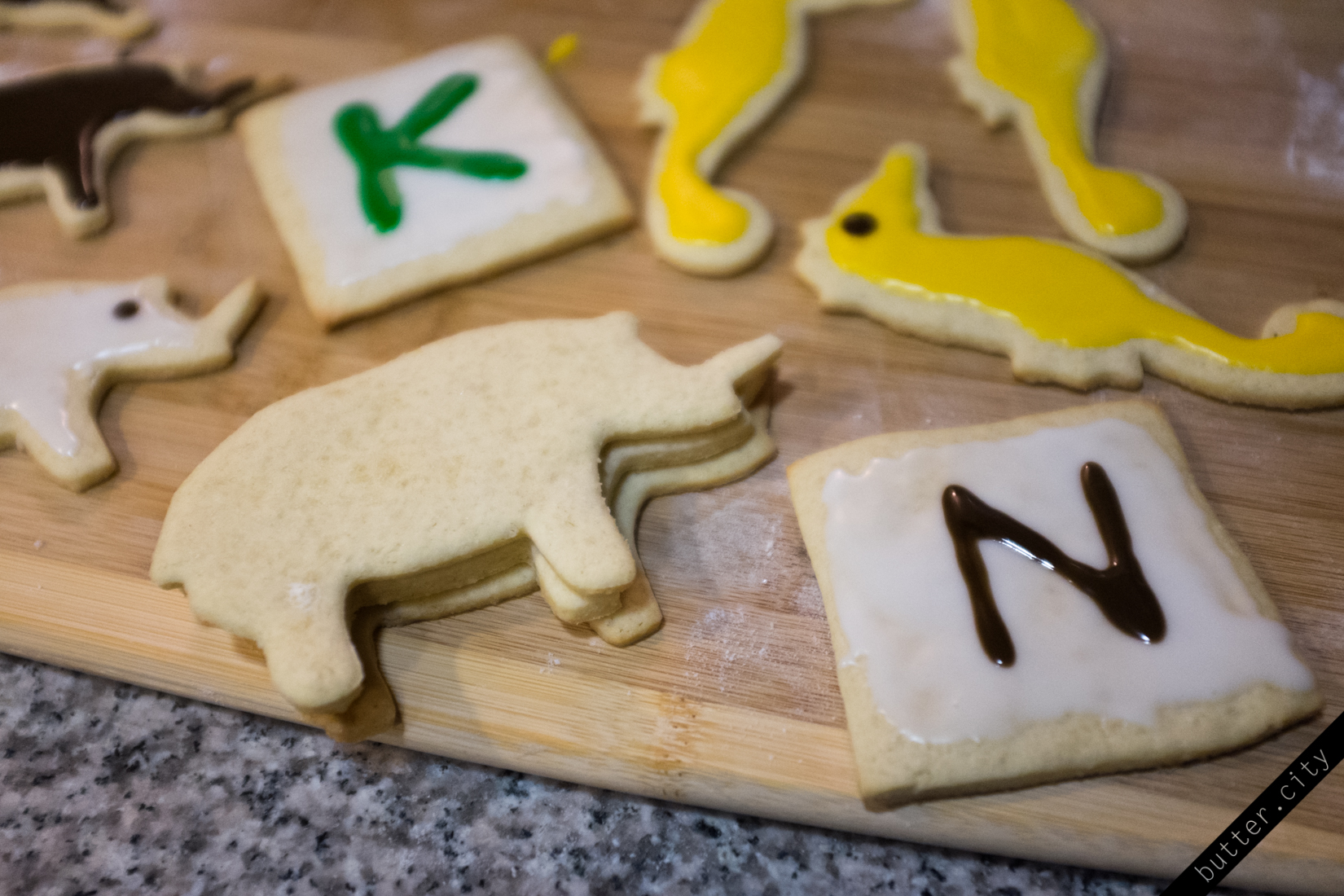 Preheat oven to 400 deg F. Roll out dough on a cutting board to about 1/4″ thick – making sure to keep dough even throughout. Dip cookie cutters in flour before cutting for easier separation. Place on parchment paper on a baking sheet, and bake for 6 minutes.