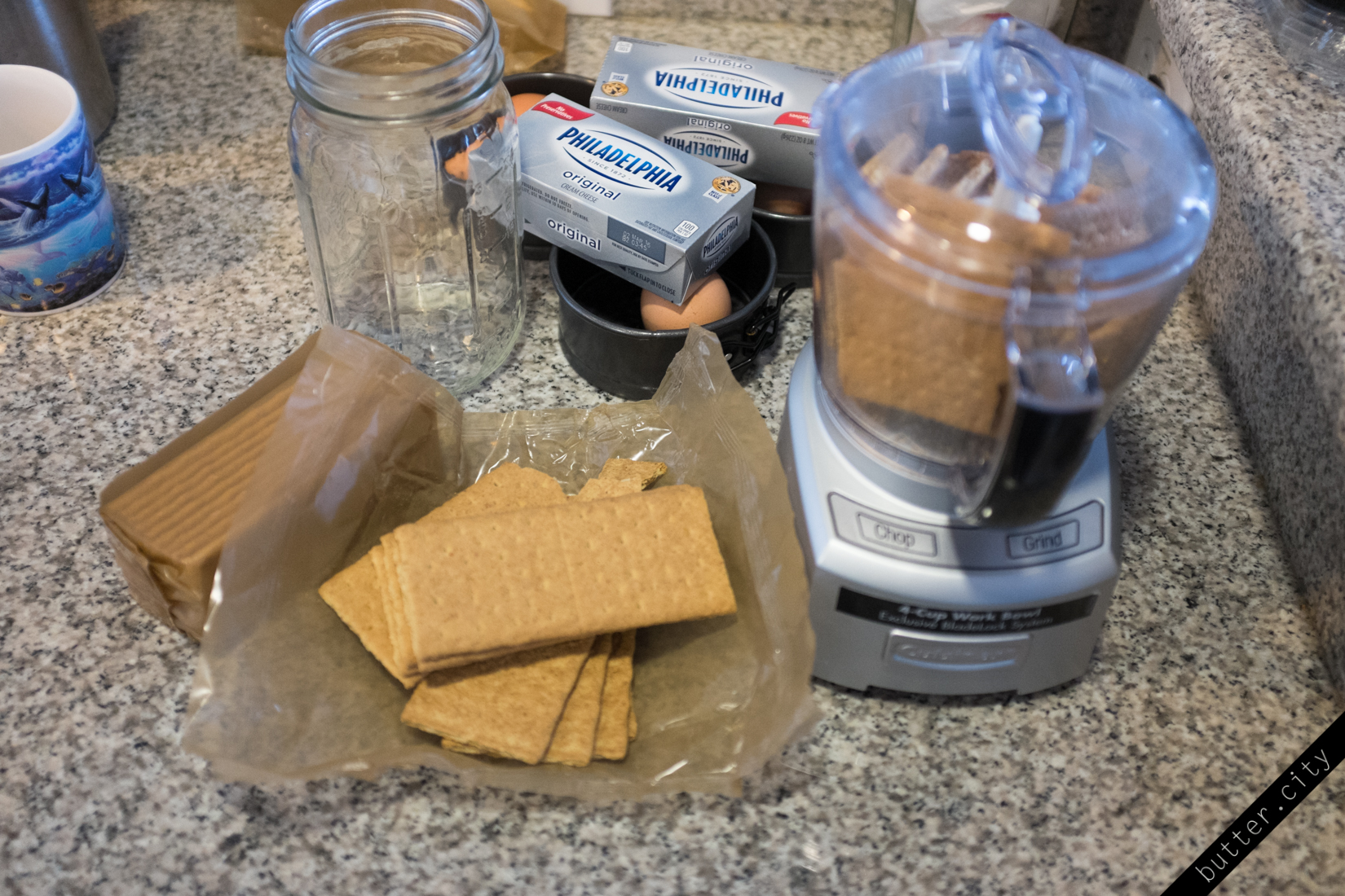 The easiest way to make ground graham crackers is with a food processor, but if you don’t have one, put the crackers in a Ziploc bag and roll over them with a rolling pin or glass bottle until crushed finely.