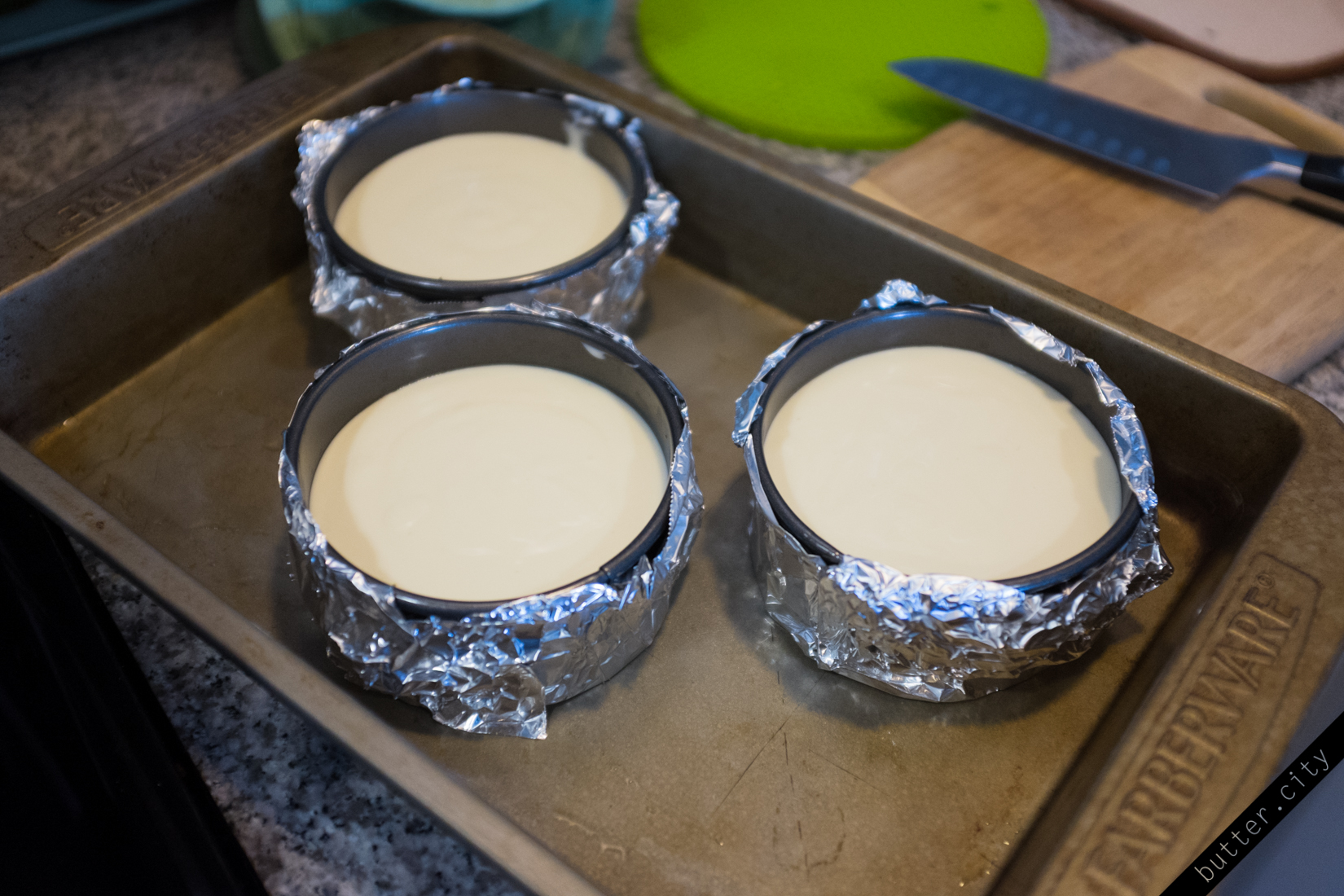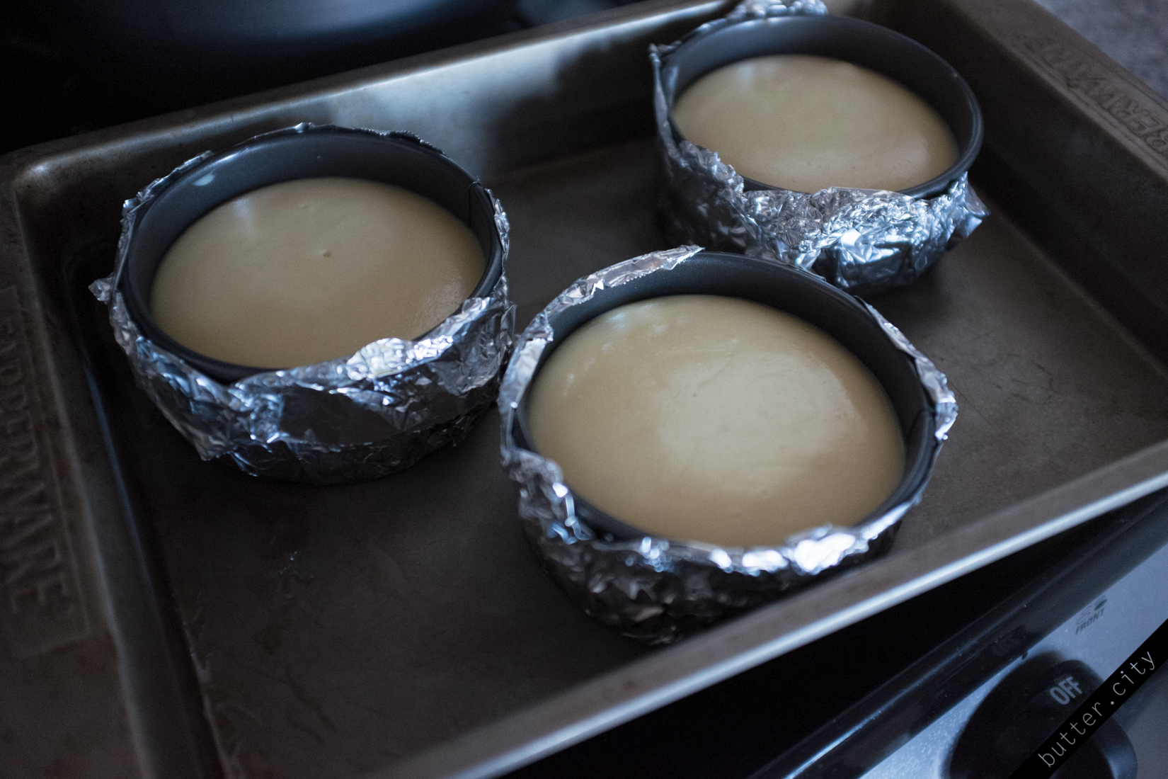 Place the three springform pans in the 9″x13″ pan, then fill the pan with about 3/4″ of hot water. Put the entire rectangular pan in the oven and bake for 75 minutes, until cheesecake edges are dry and a toothpick comes out clean. Worried about an ugly toothpick mark? Make some fresh fruit compote to go with it 🙂