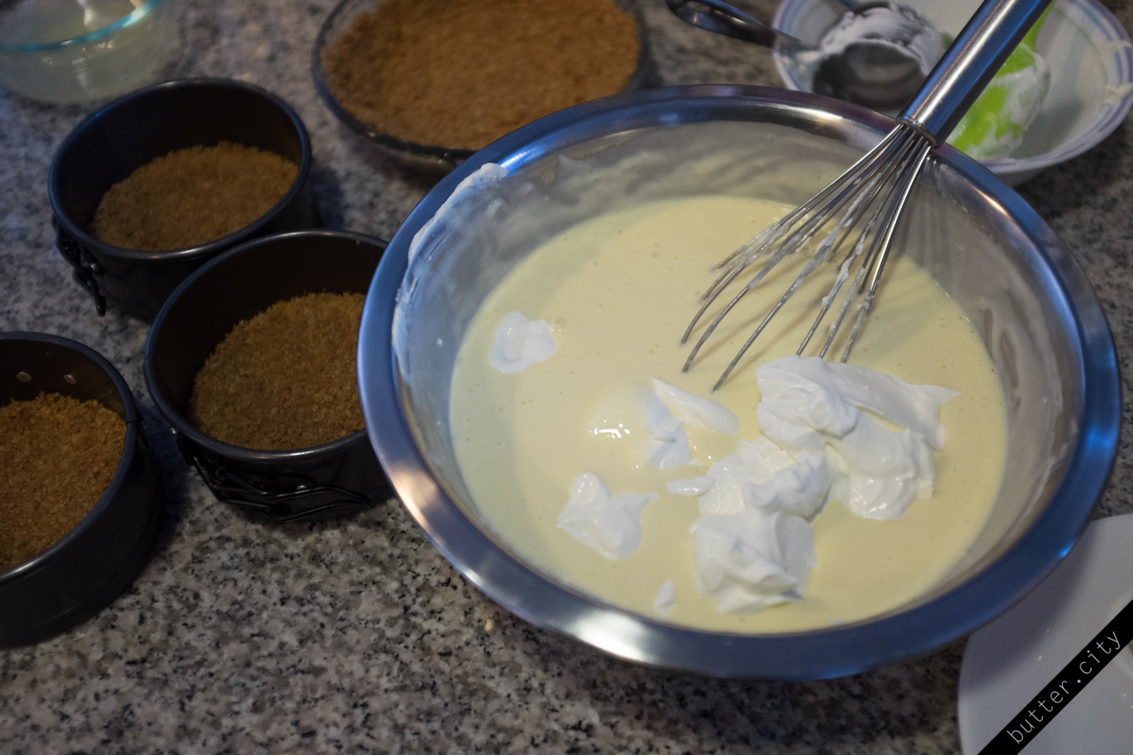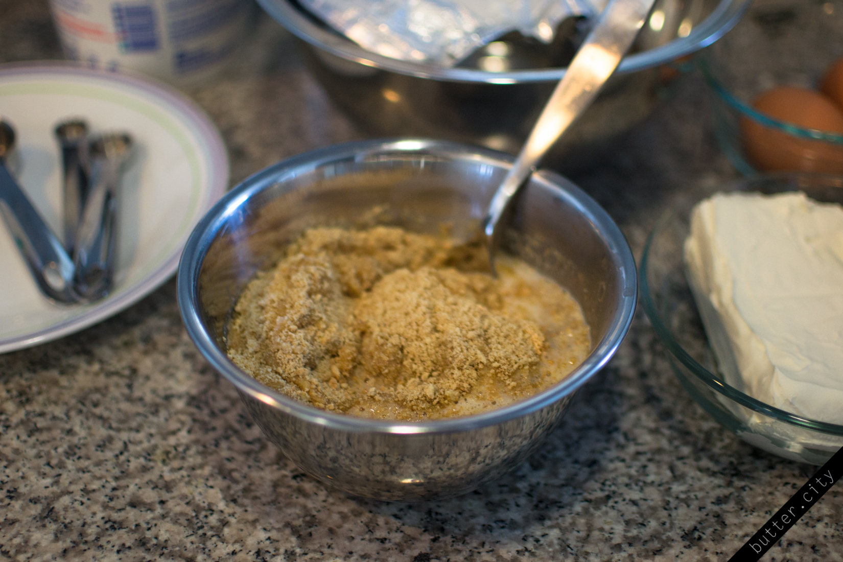 Mix 2 c graham cracker crumbs, 1/2 tsp ground cinnamon and 6 Tbsp unsalted butter, melted in a small bowl. Divide evenly into the three springform pans and press with your fingers into the base and up the walls of the pan. Wrap the bases of the springform pans with aluminum foil tightly, to keep the bases water tight. Set aside.