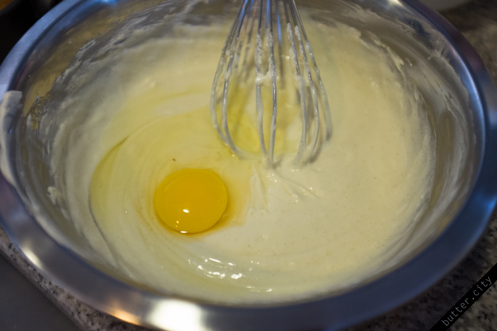 In a large bowl, use a whisk to cream together 8 oz softened cream cheese and 1/3 c granulated sugar. When combined and smooth, mix in 2 large eggs, one at a time. Then stir in 5 oz sour cream, 2/3 tsp vanilla extract and 2/3 tsp lemon juice. Pour into prepared pans.