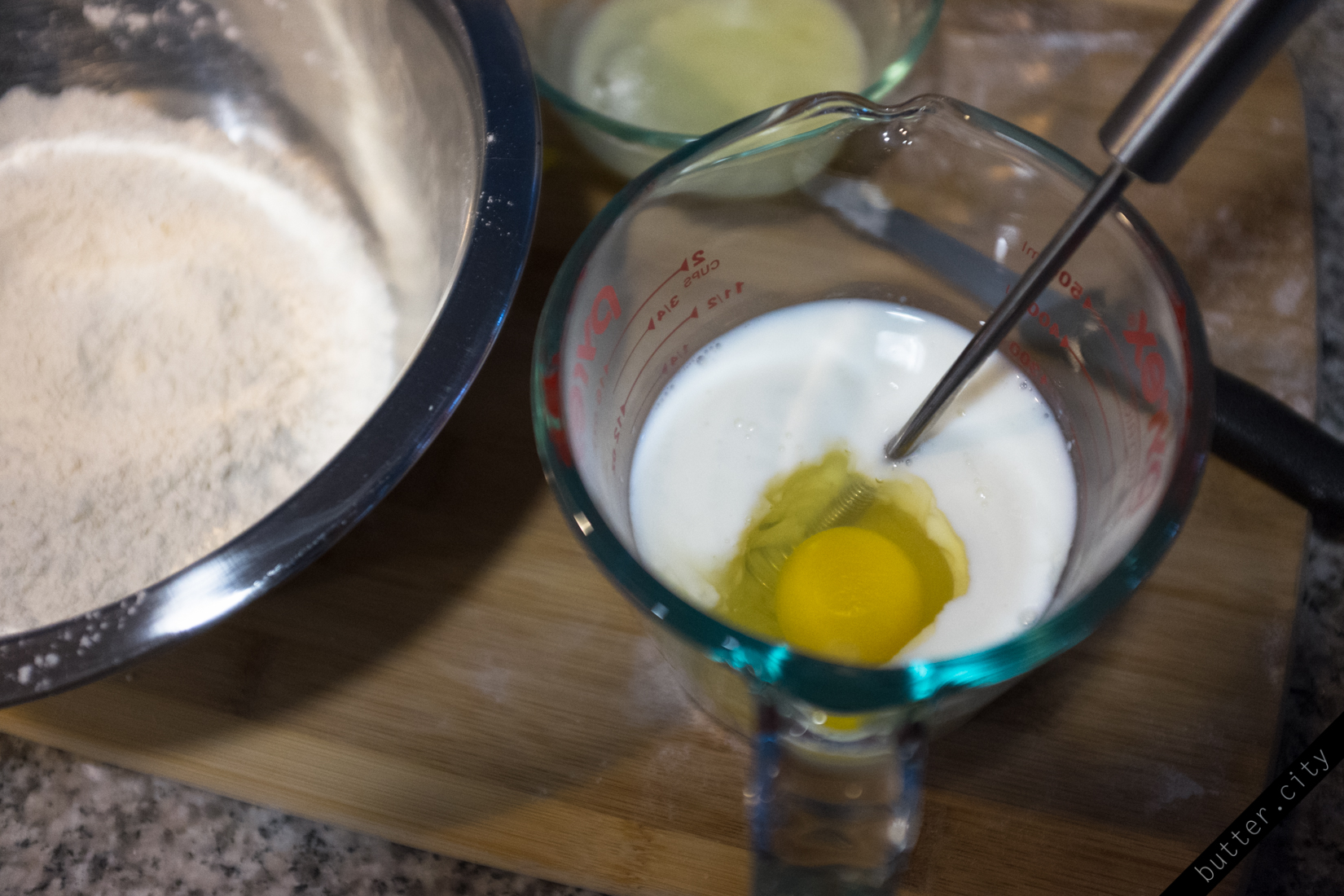 In a large bowl, mix together dry ingredients: 1 c flour, 1 Tbsp sugar, 1 tsp baking powder, 1/2 tsp baking soda and dash salt. Separately, in a 2 cup liquid measuring cup, beat together 1 c buttermilk, 2 Tbsp unsalted butter, melted and 1 large egg. When your partner is just starting to get their lazy butt out of bed, pour wet ingredients into dry and stir with a spatula until just combined.