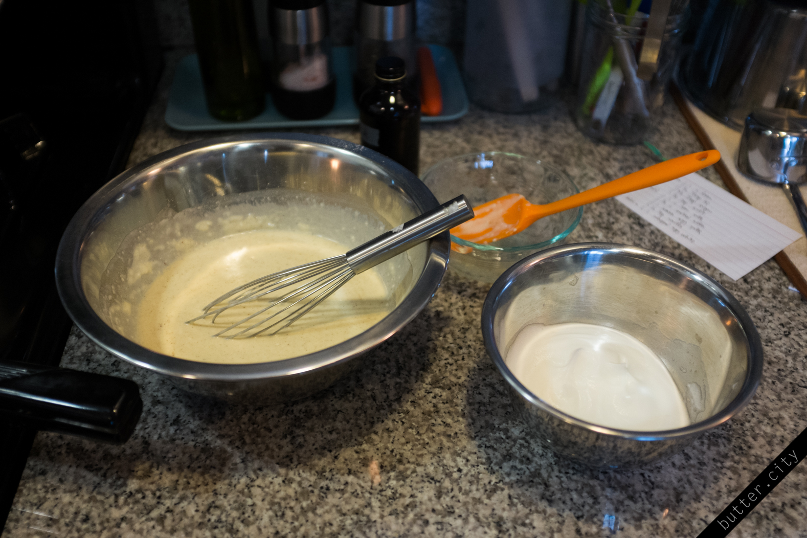 Whip egg white ’til soft peaks, the fold into the batter with a spatula until just combined.