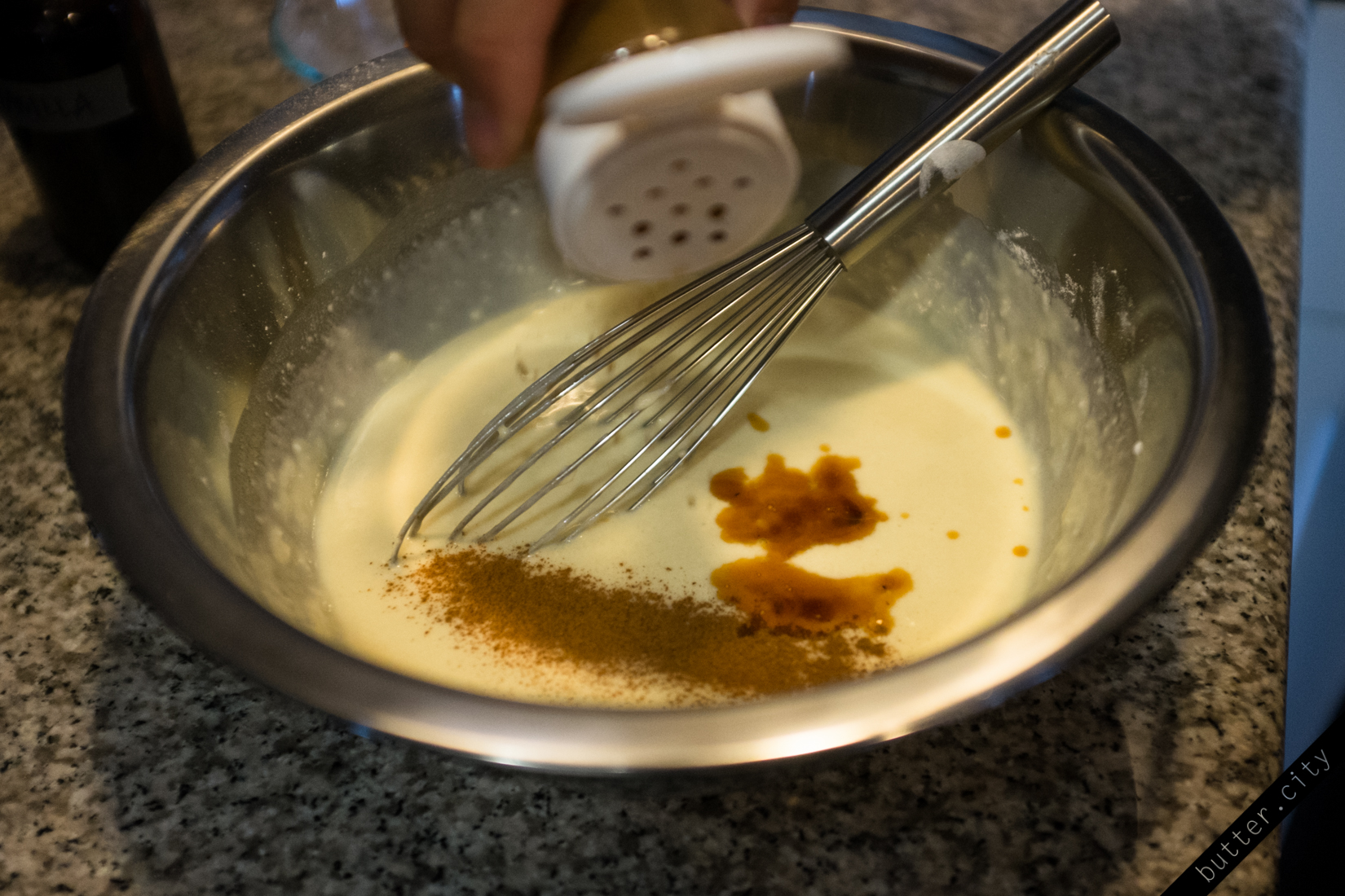 Melt 1/4 c unsalted butter in the microwave. In a heat proof liquid measuring cup, heat 3/4 c milk until lukewarm. Add in the melted butter, slightly beaten egg yolk, 1/2 tsp vanilla extract and an optional 1 tsp ground cinnamon. Pour all liquid ingredients into the dry ingredients, mix well with a whisk.
