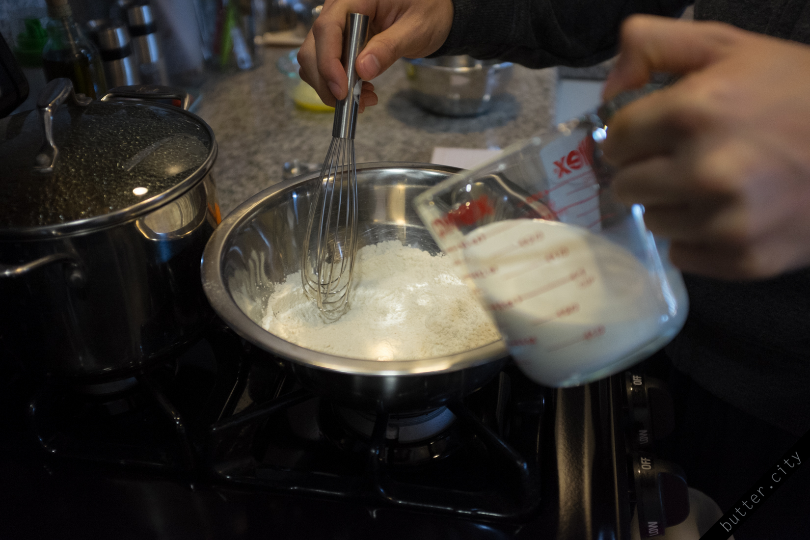 In a large bowl, combine dry ingredients: 1 c all-purpose flour, 1/2 Tbsp baking powder, 3/4 Tbsp granulated sugar and a pinch salt. Set aside.