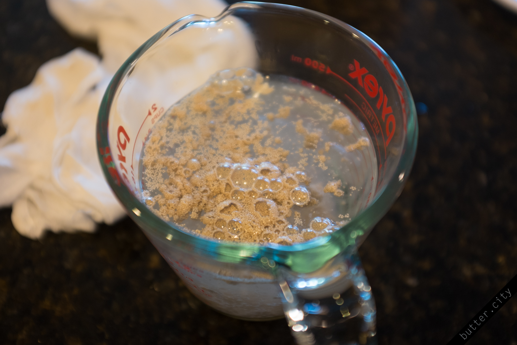 In a liquid measuring cup, combine 1 3/4 c warm water, 2 1/4 tsp active dry yeast and 1 Tbsp granulated white sugar. Mix roughly and let sit for 10 minutes. Check that yeast bubbles in the warm water, otherwise your yeast has expired.