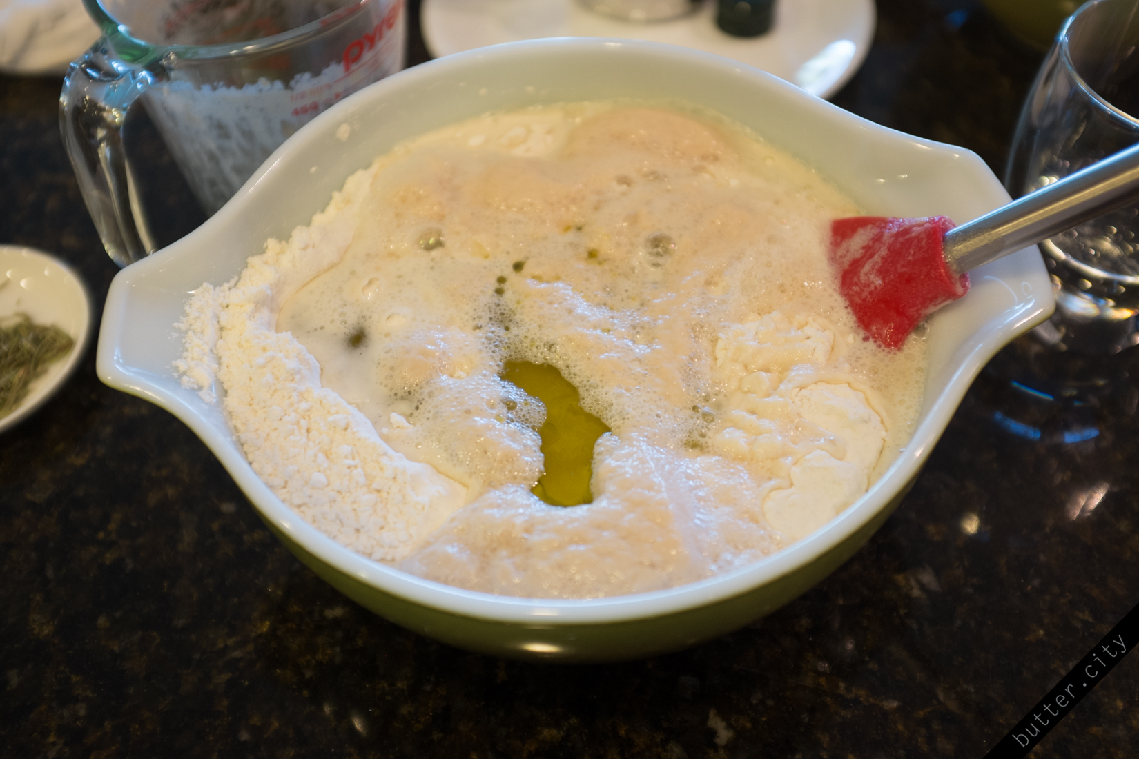 While the yeast is being proofed, in a large bowl, combine 5 c all-purpose flour and 1 Tbsp salt. When time is up, add the yeast mixture to the flour mixture along with 1/2 c extra virgin olive oil. Mix with a large spatula just until the flour is fully integrated and dough has an even texture. Then, knead with your hands in the bowl for about 5 minutes until dough becomes smooth and can barely hold it’s shape. Lift the dough briefly and pour about 1 tsp extra virgin olive oil into the mixing bowl, then place the dough back into the bowl, flipping to coat the dough mount with the oil. Cover bowl with plastic wrap and let rise for about an hour, or until dough has about doubled in size.