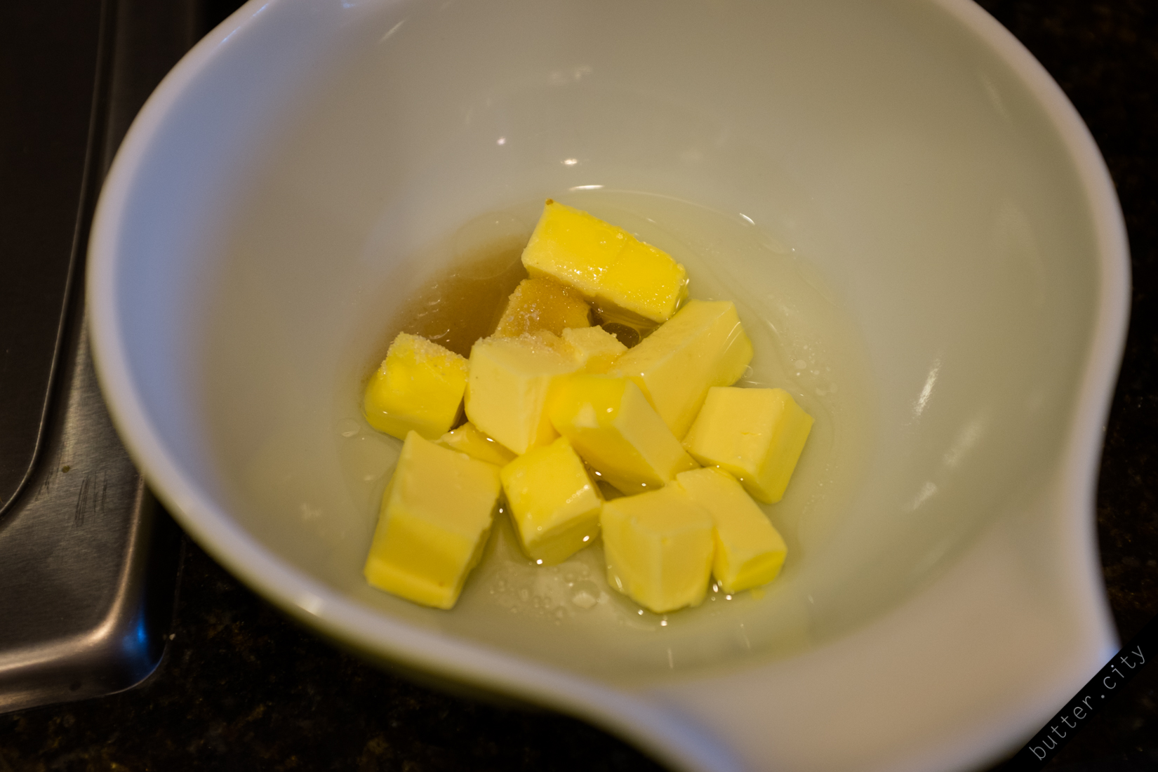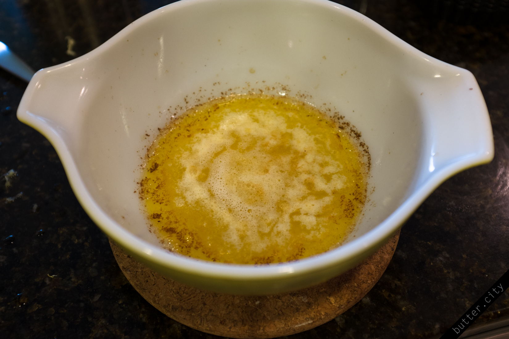 Preheat the oven to 410 deg F. In your oven safe bowl, combine 6 Tbsp unsalted butter, cubed, 1 Tbsp vegetable oil, 3 Tbsp water, 1 Tbsp granulated white sugar and dash salt. Heat in oven for 15 minutes, until butter is bubbling and brown on the edges. Remove from oven and immediately toss in 1 heaping cup all-purpose flour, loose, then stir with a spatula until fully combined and mixture has a paste-like texture.