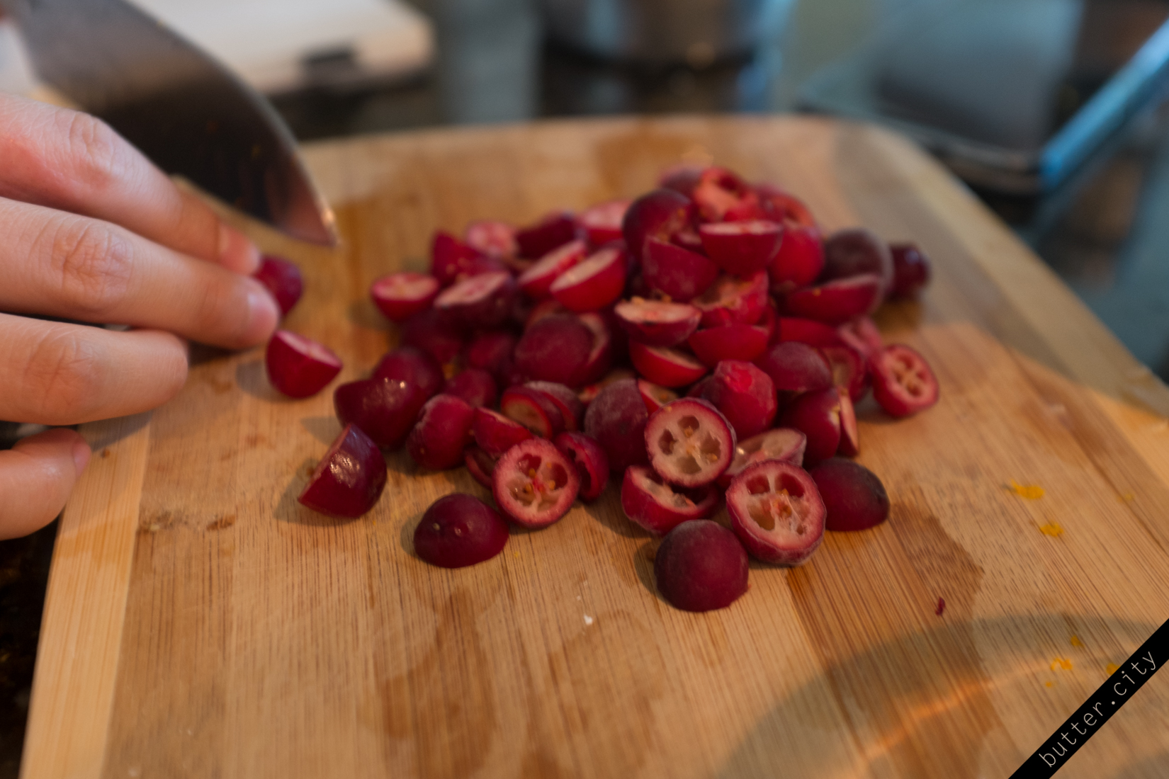 Ok, I’ll be honest. I bought two giant bags of fresh cranberries… for Thanksgiving. It’s June now, and I finally took second crack at the half bag still in my freezer. Quite happy to report cranberry useage a success! Also special guest hands: Heather!!