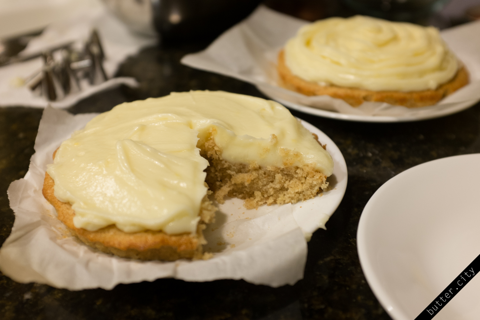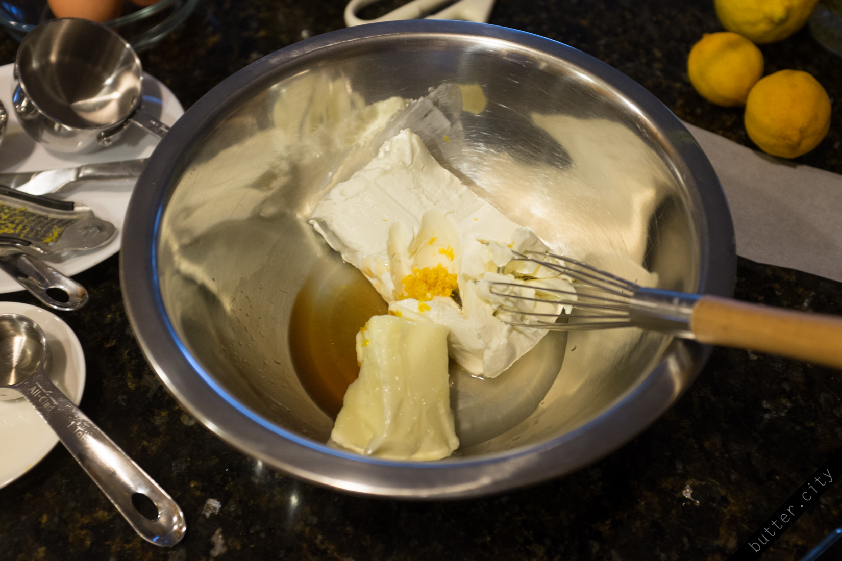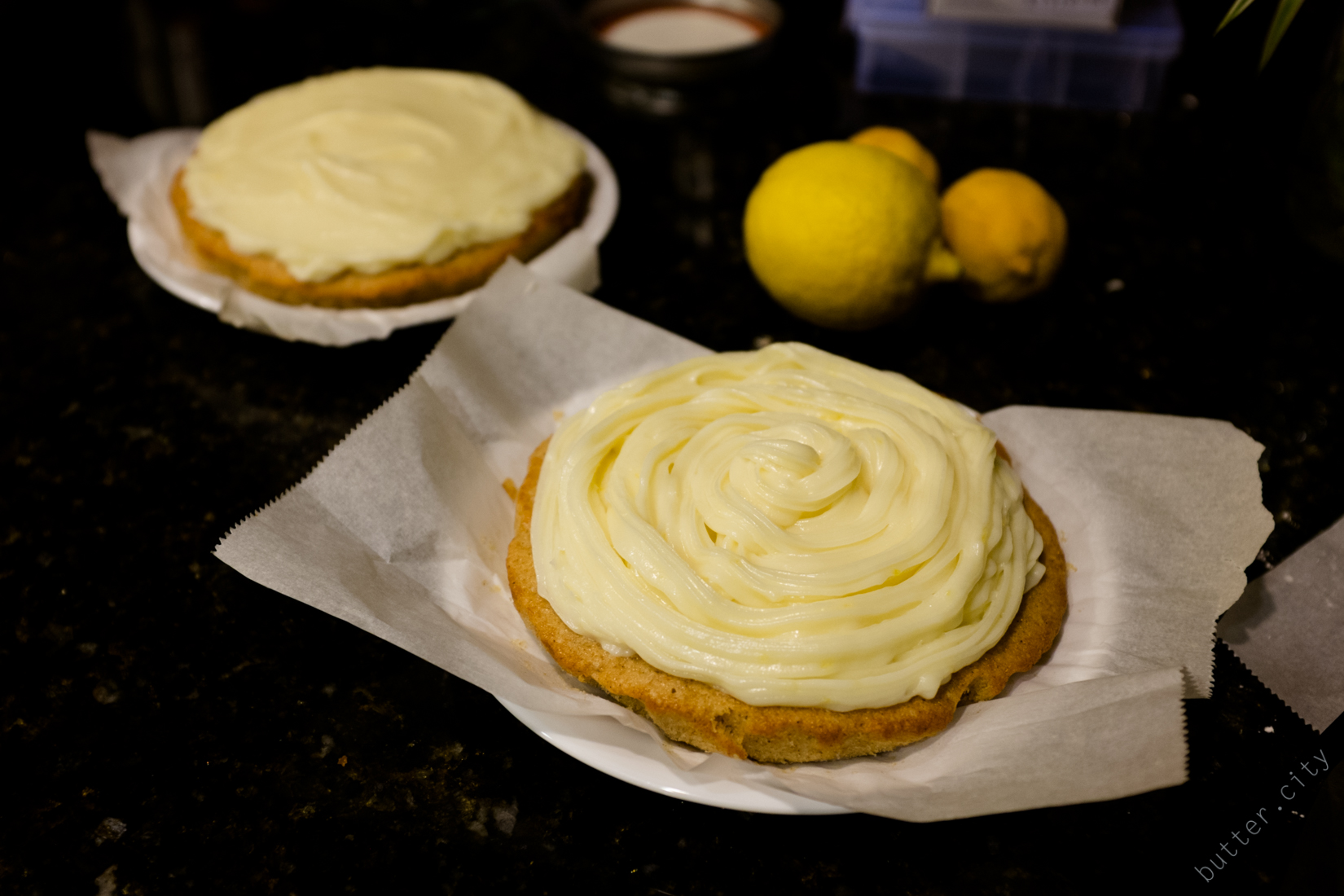 To make frosting, cream together all ingredients until well combined, adding powdered sugar to taste: 4 oz cream cheese, at room temperature, 2 Tbsp butter, softened, 1 1/2 tsp lemon juice, 1 tsp lemon zest and about 1 c powdered sugar.