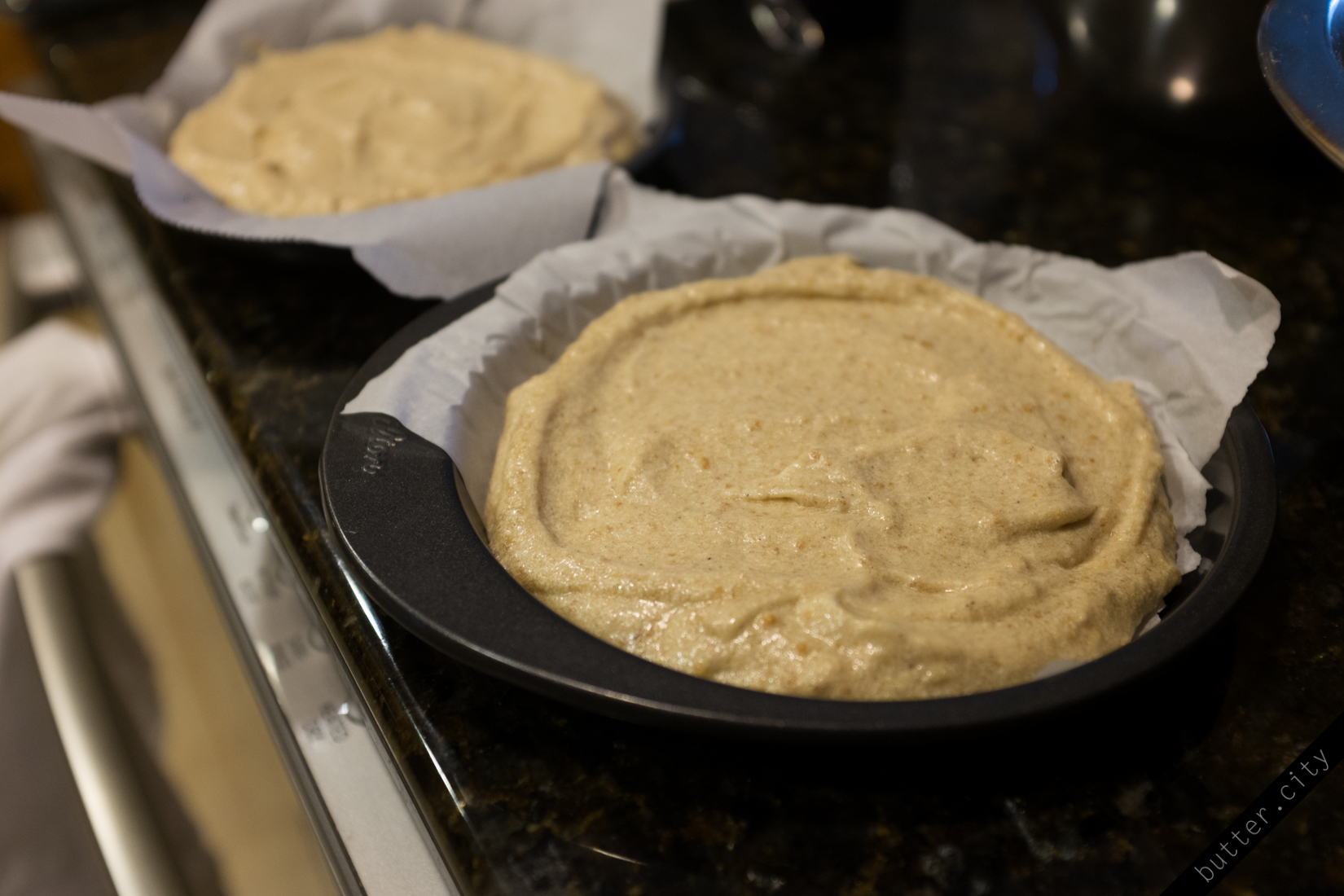 Preheat oven to 350 deg F. Line two 6″ cake pans with parchment or a cupcake pan with cupcake liners.