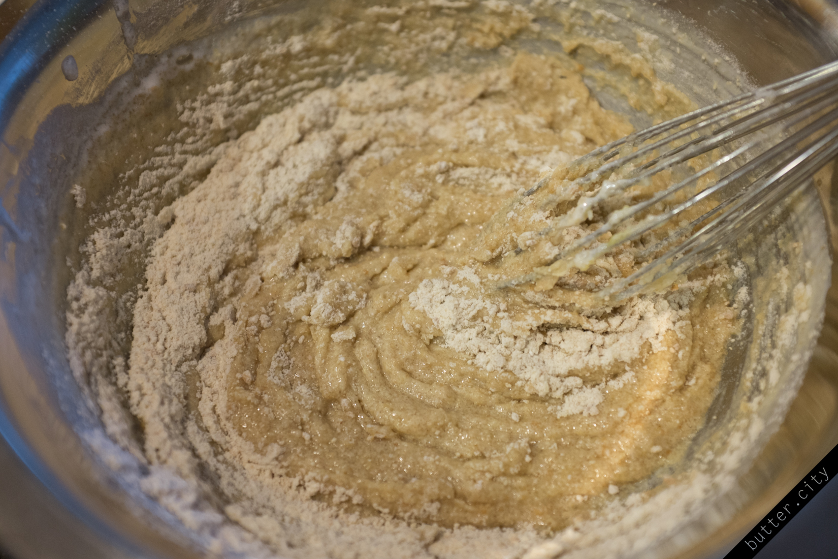 In the large bowl, cream together 4 Tbsp unsalted butter, at room temperature and 1/2 c granulated sugar until fluffy. Mix in 1 large egg, at room temperature. To buttercream, alternate adding dry and wet ingredients, beginning and ending with flour (thirds of dry ingredients, halves of wet ingredients).
