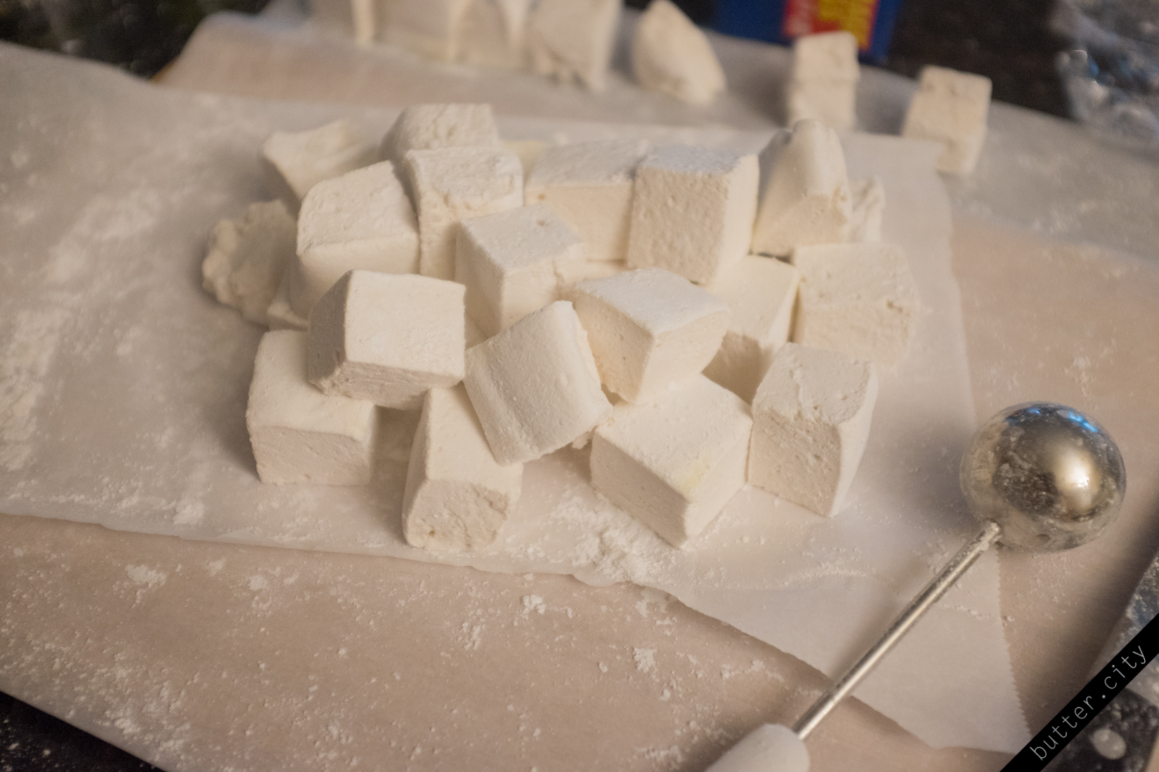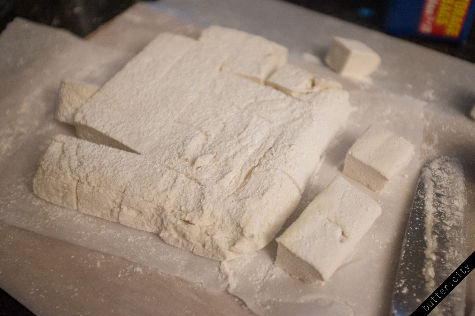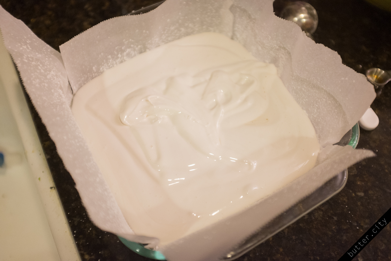 Ok, with this new experience I can officially define a marshmallow to be 80% texture, 10% flavor, and 10% flavor-of-the-powdered-sugar-coating. I tried a bit of the goopy mess before it dried out, and it was not delicious. Tasted like plastic. But somehow, magically, after drying out overnight and getting coated in powdered sugar, I am at risk for eating the entire batch by day’s end. Help.