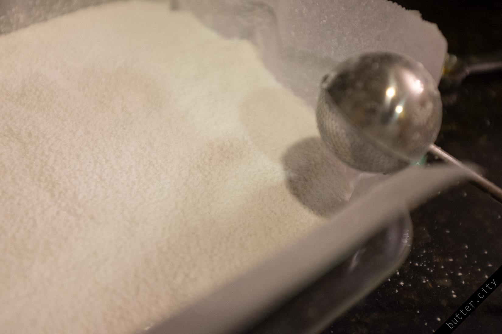 While sugar mixture is heating up, prepare the dish. Line the dish with parchment paper and generously coat the bottom and sides with a layer of powdered sugar. When I say generously coat, I mean until you can’t see the parchment paper anymore.