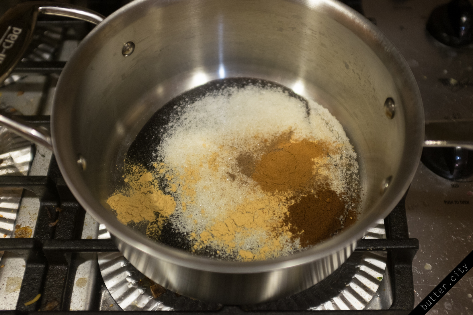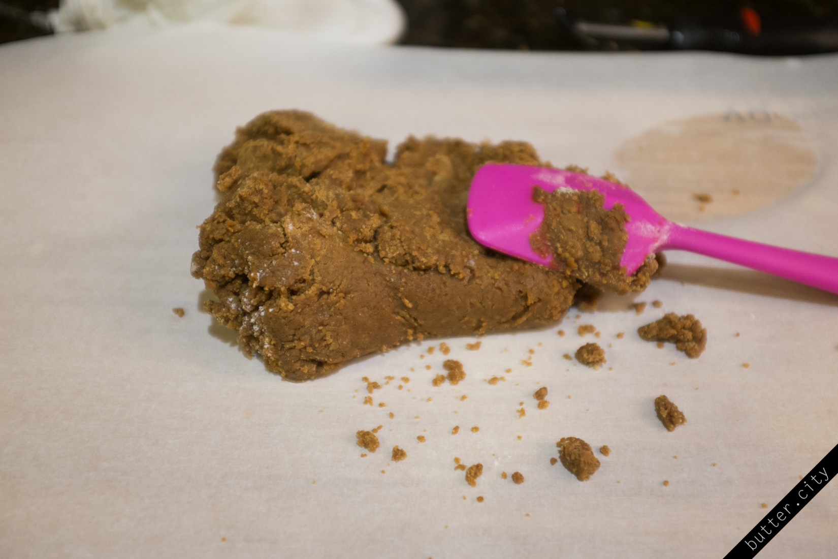 In a medium pot, mix 1/2 c granulated sugar, 1 1/2 tsp ground ginger, 1 tsp allspice, 1 tsp ground cinnamon, 1 tsp ground cloves and 1/2 c (140 g) dark molasses. Heat under medium heat until lightly boiling, stirring occasionally. Remove from heat then add 2 tsp baking soda. Mixture will foam up slightly. When combined, add in 1/2 c butter, cut in chunks and stir until melted. Follow with 1 large egg, beaten, then 3 1/2 c all-purpose flour. Dough will be malleable but thick (like gingerbread usually is).