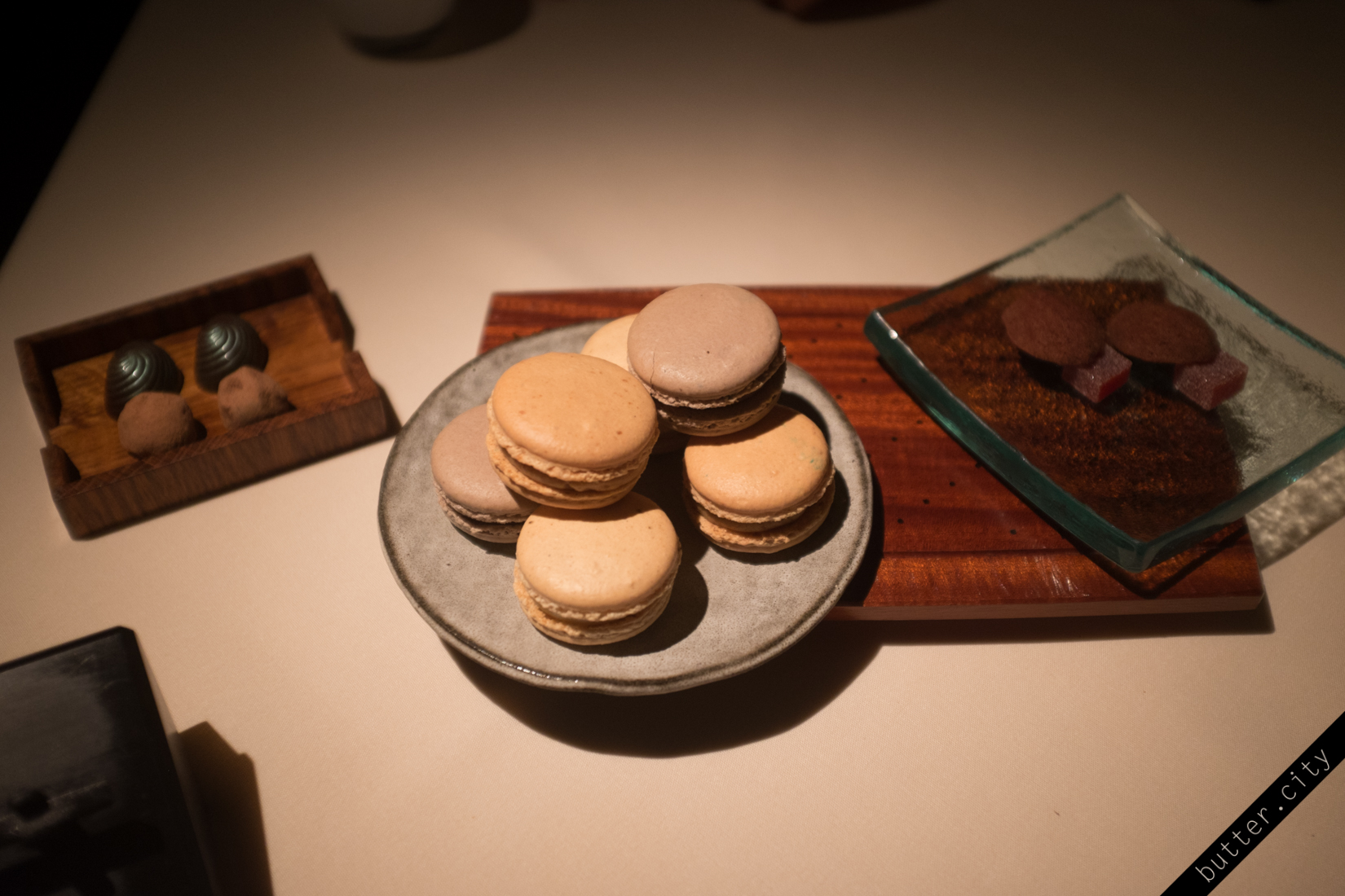 Our closing petit fours and macarons and truffles. None of it memorable. Horchata, lavender, and key lime macarons that tasted stale and had weak/undiscernable flavors, and definitely were stale because when we toured the kitchen they were putting away the next day’s macarons already. Black sesame flavor! The pate de fruits were probably my favorite… strawberry lol.