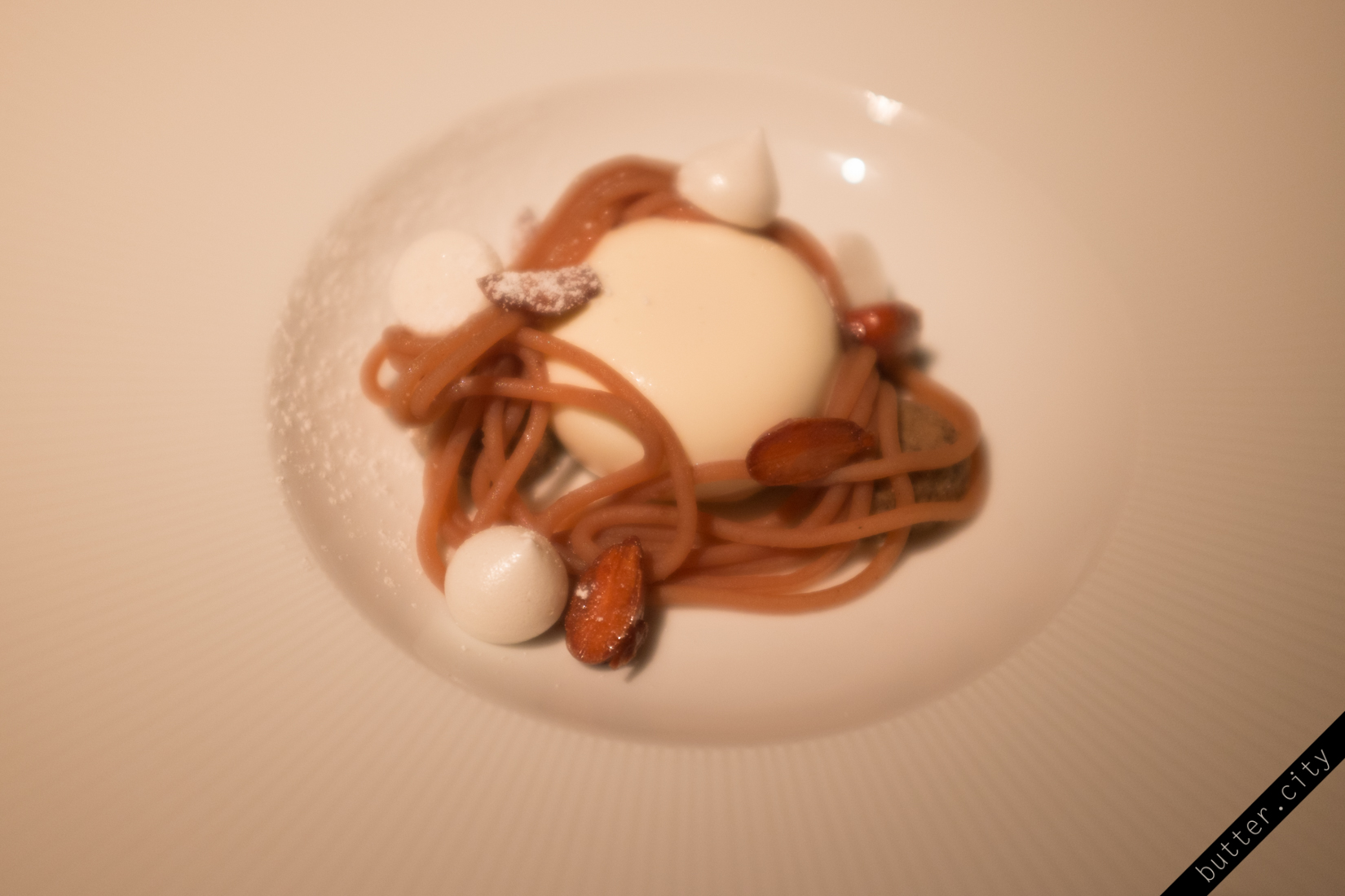 Printed menu description: “Mont blank, coffee and vanilla…”. My notes: Some kind of cream ball with a vanilla ice cream layer on the outside. Milk chocolate strings/spaghetti (strange texture that I didn’t enjoy… reminded me of what play-doh probably tastes like). Meringues and candied nuts were my favorite part of this dessert.