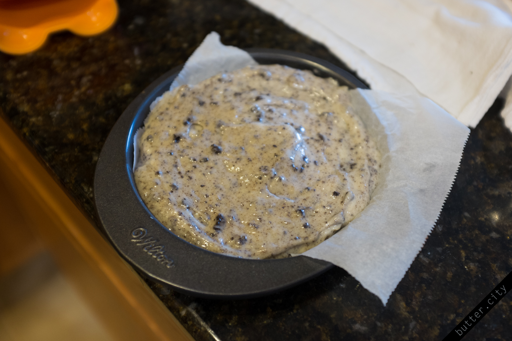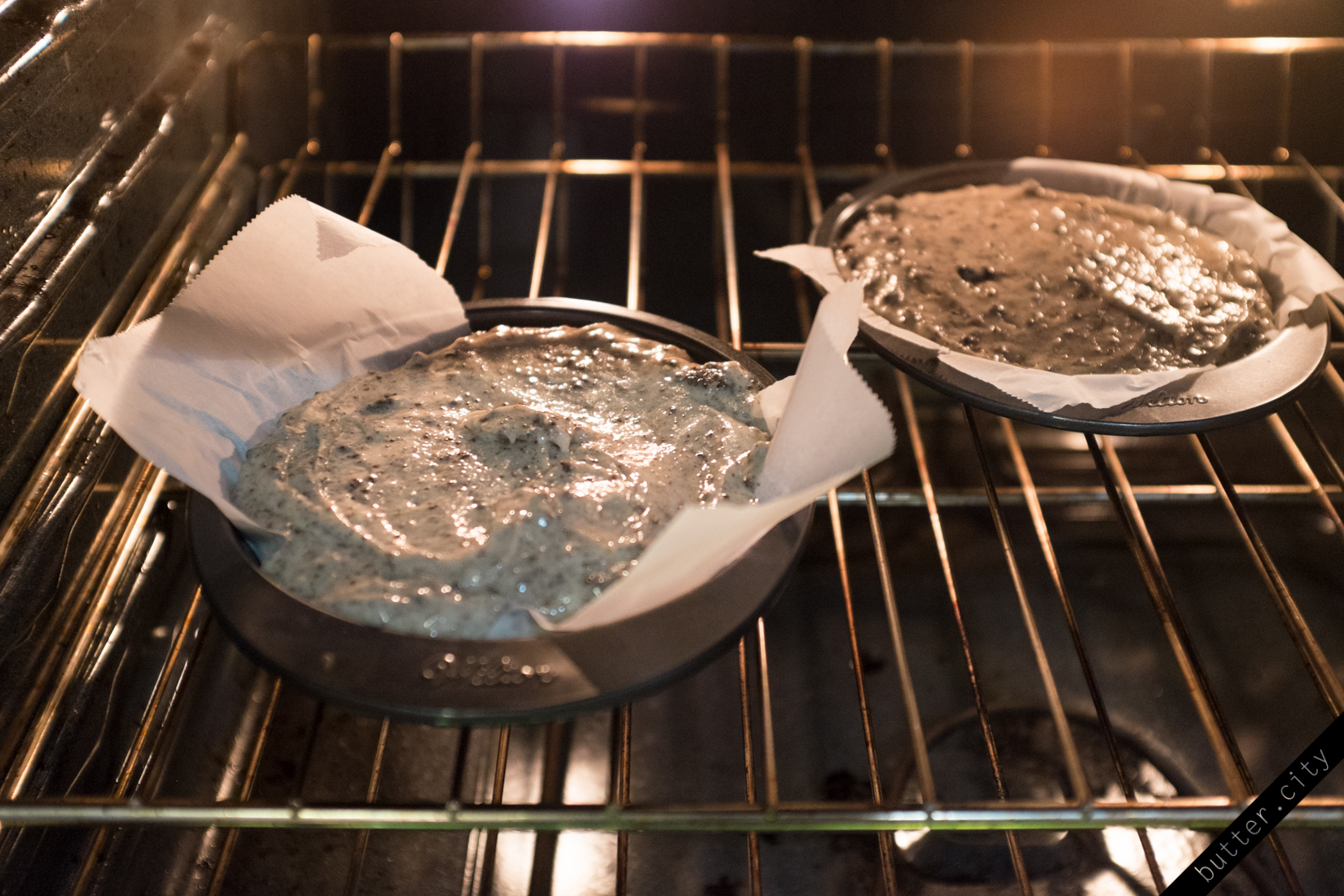 Pour batter into parchment-lined cake pans. Bake for typical time for cake of that size, until a toothpick comes out clean.