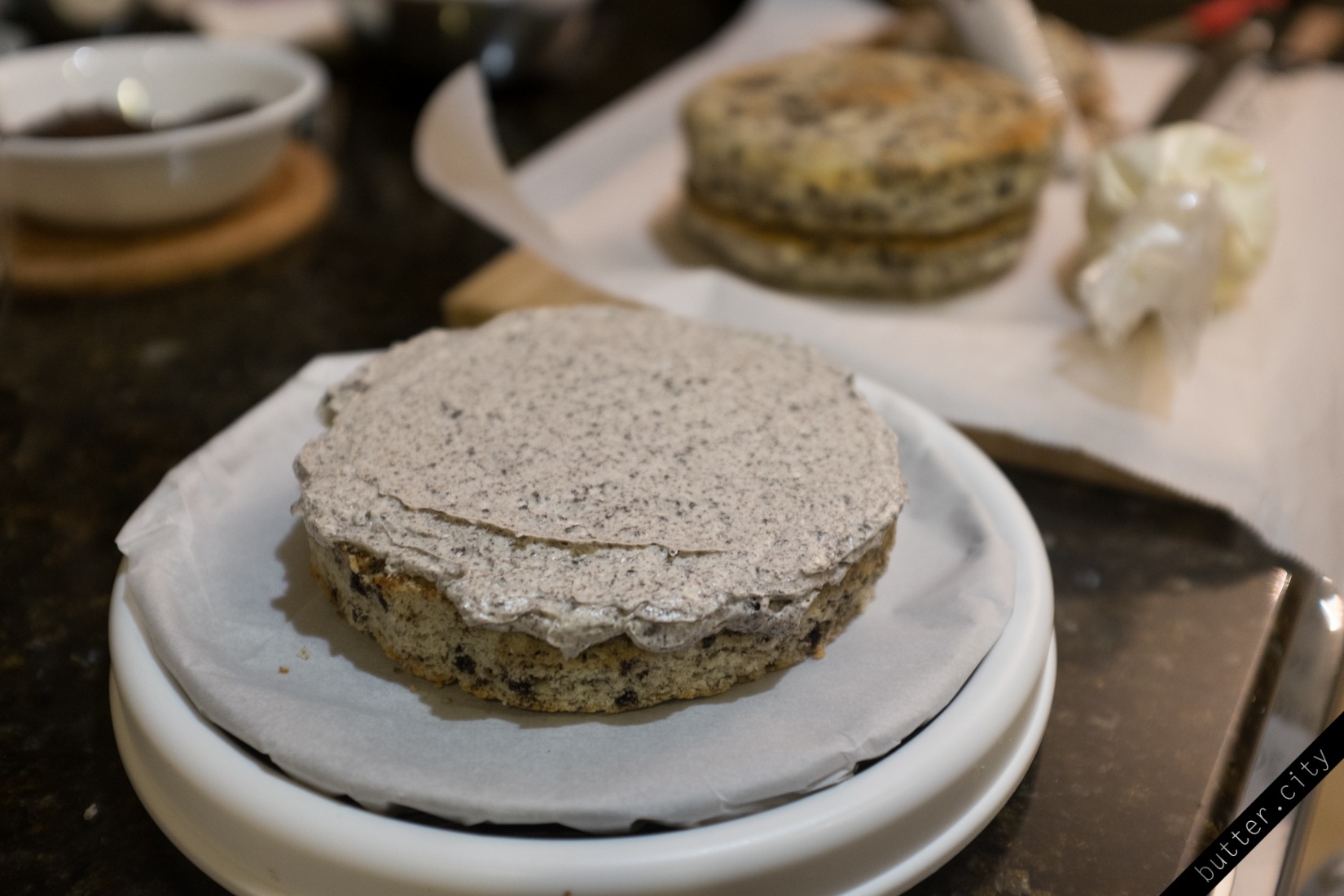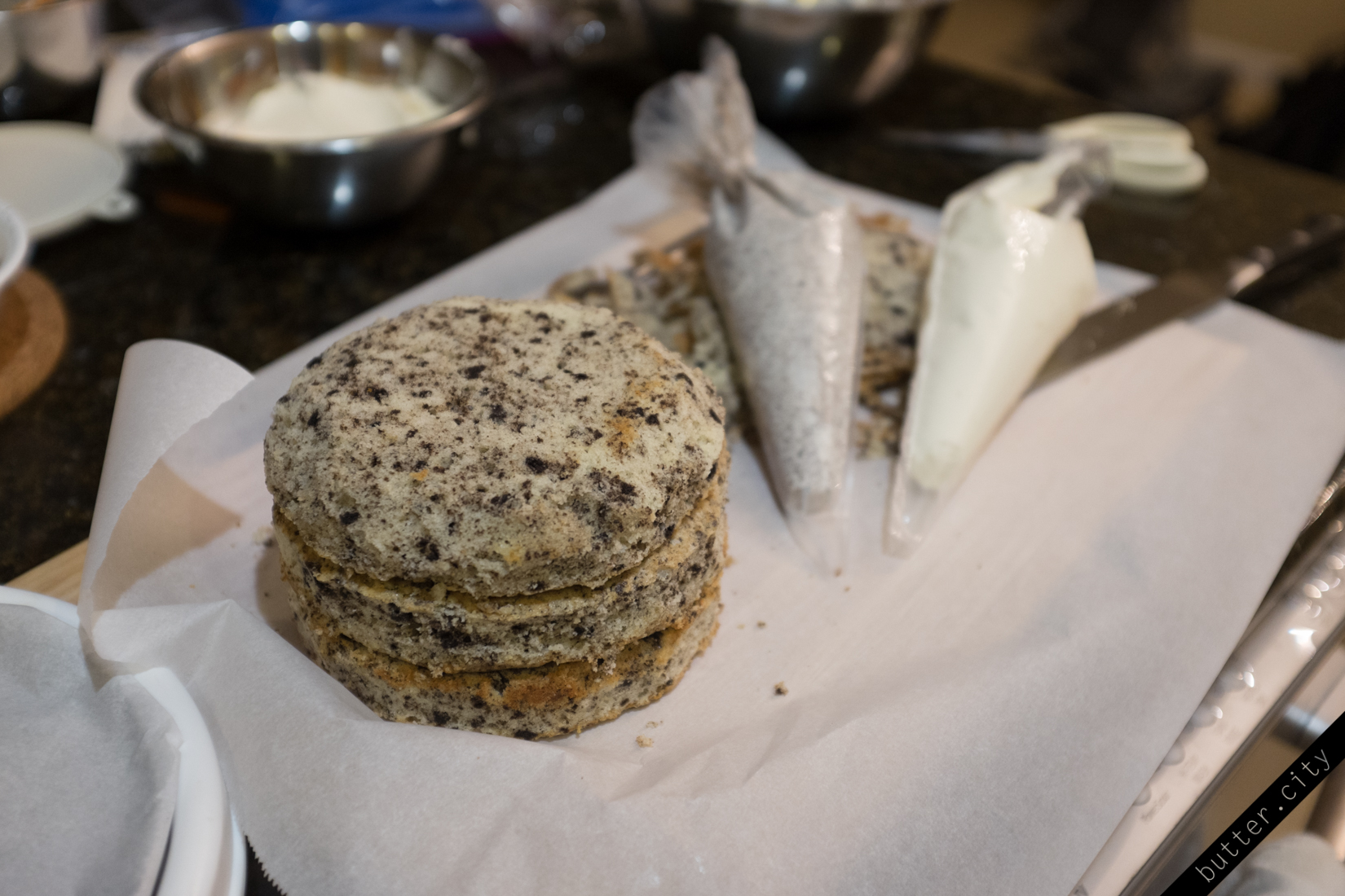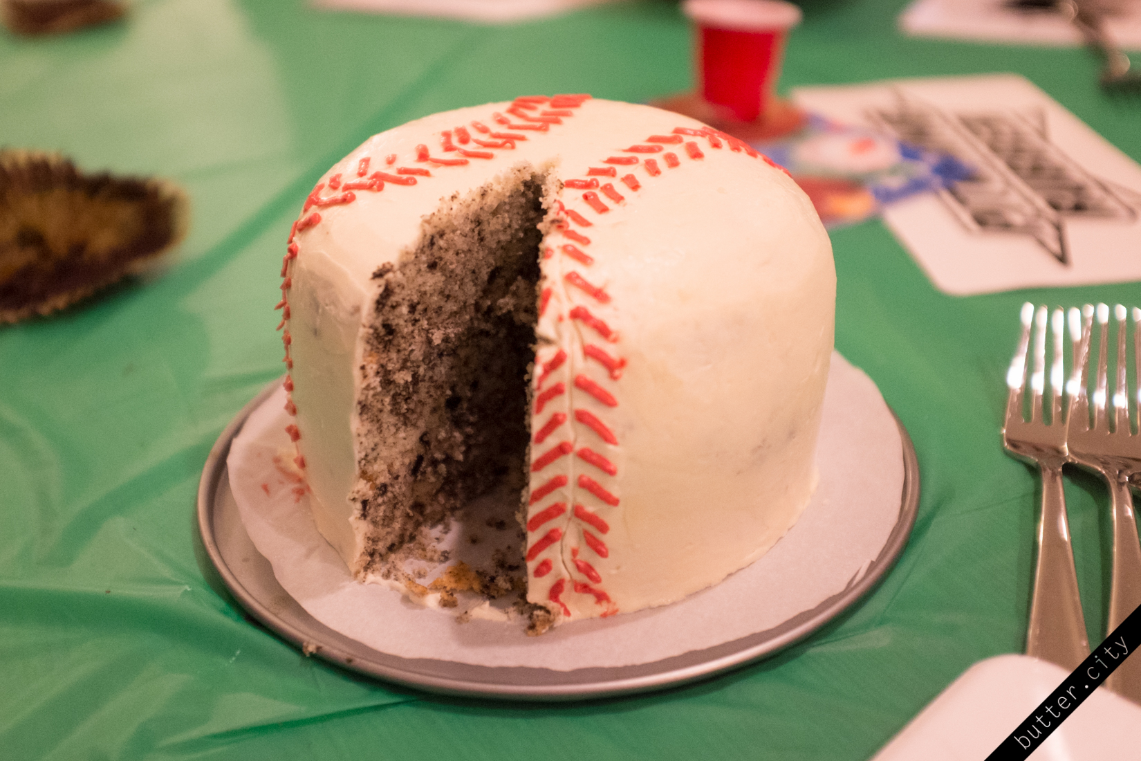 A cake that looks like a baseball! Sports! Heh. Made this for a friend’s birthday a few months ago, a small cookies and cream cake, with swiss buttercream frosting (separate post). The cake was pretty moist. Cookies and cream buttercream was good, but I think could be a bit sweeter like a real Oreo. Overall, I thought it was delicious!