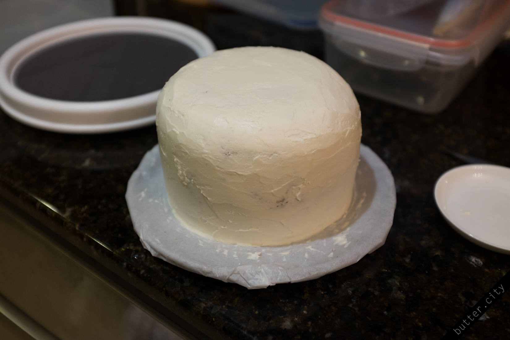 In these pictures, I made a 6″ 3-layer cake with swiss buttercream frosting inside and out. Recipe for that coming soon!